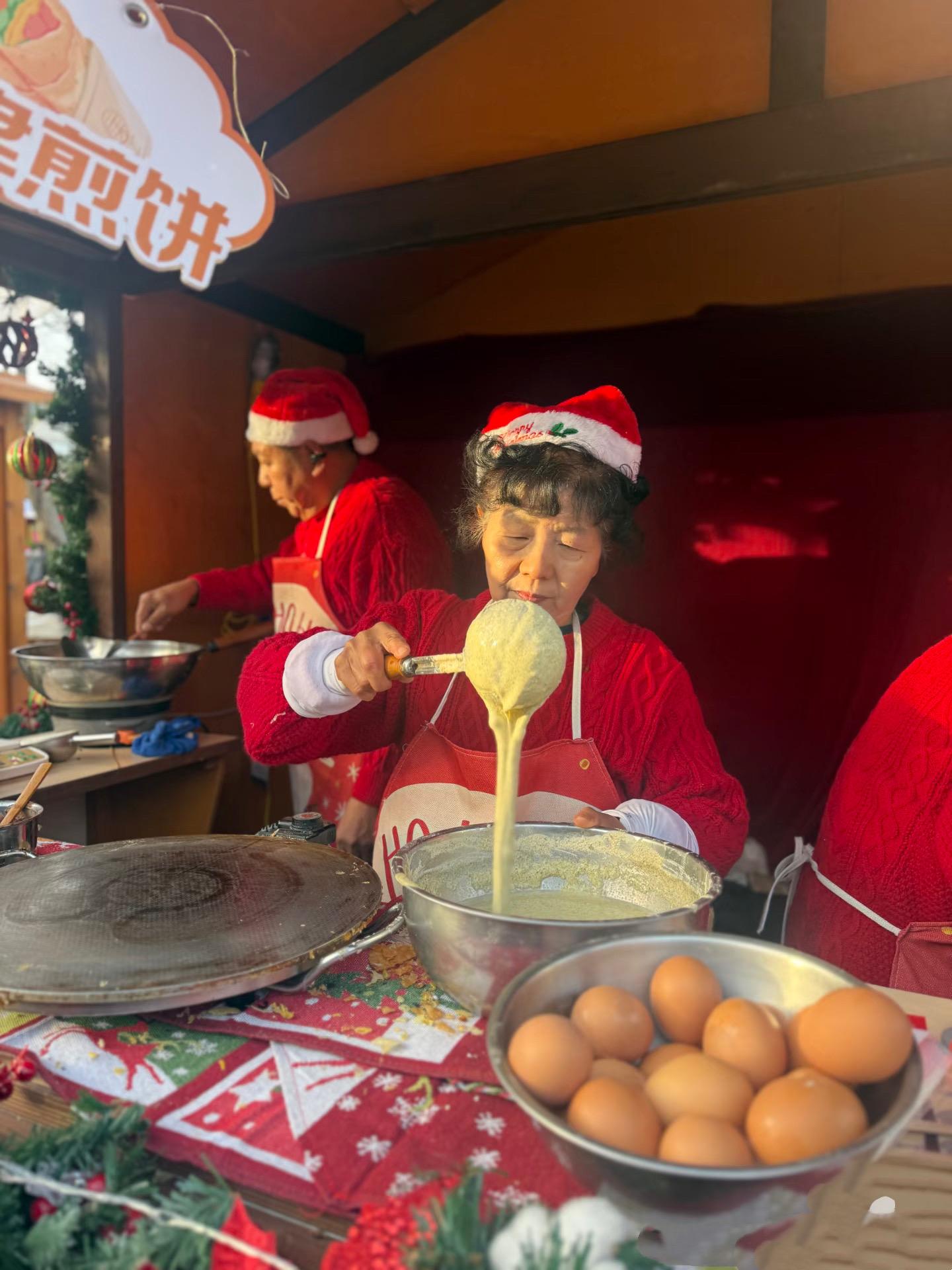 不僅有棉花糖、還有雞蛋煎餅,感覺就跟我們這邊的集市一樣的。只不過融入了聖誕元素,大家都穿着聖誕衣、帶着聖誕帽,經營的場景也都是聖誕元素,多了這種信息的傳達在裏面。