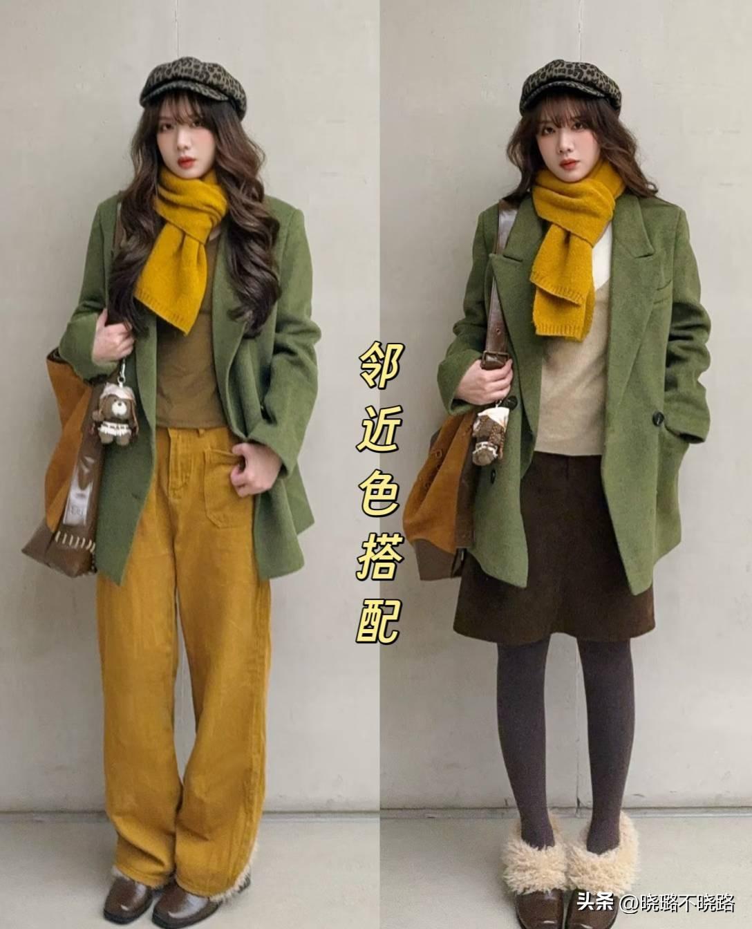 •下裝:顏色和大衣選擇鄰近色,例如薑黃色燈芯絨闊腿褲,或者搭配棕色的A字裙,營造出復古感。