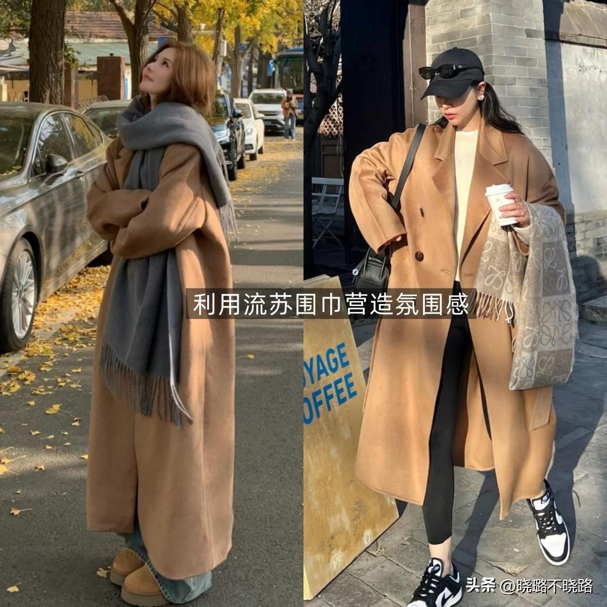 肉桂色大衣配闊腿褲,鞋子要帶點厚底設計,如果配貼合度比較高的鯊魚褲,鞋底厚度適中即可,想要營造出氛圍感,流蘇款的羊絨圍巾,絕對是不二之選!