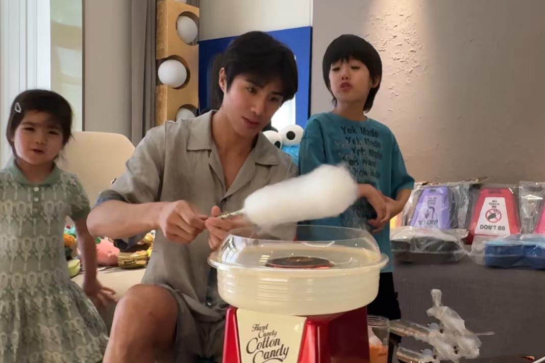 姜潮在帶娃上,也很厲害。他還會做棉花糖,看丹尼爾盯着爸爸手裏棉花糖的模樣,就知道小夥子饞的要流口水了。丹尼爾從小就很帥氣,越長大越像爸爸了。