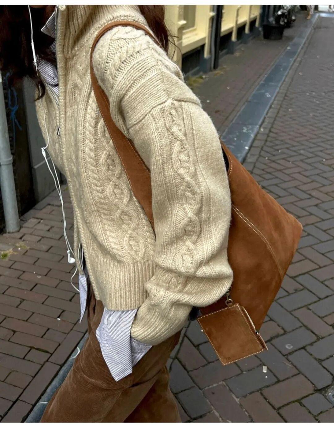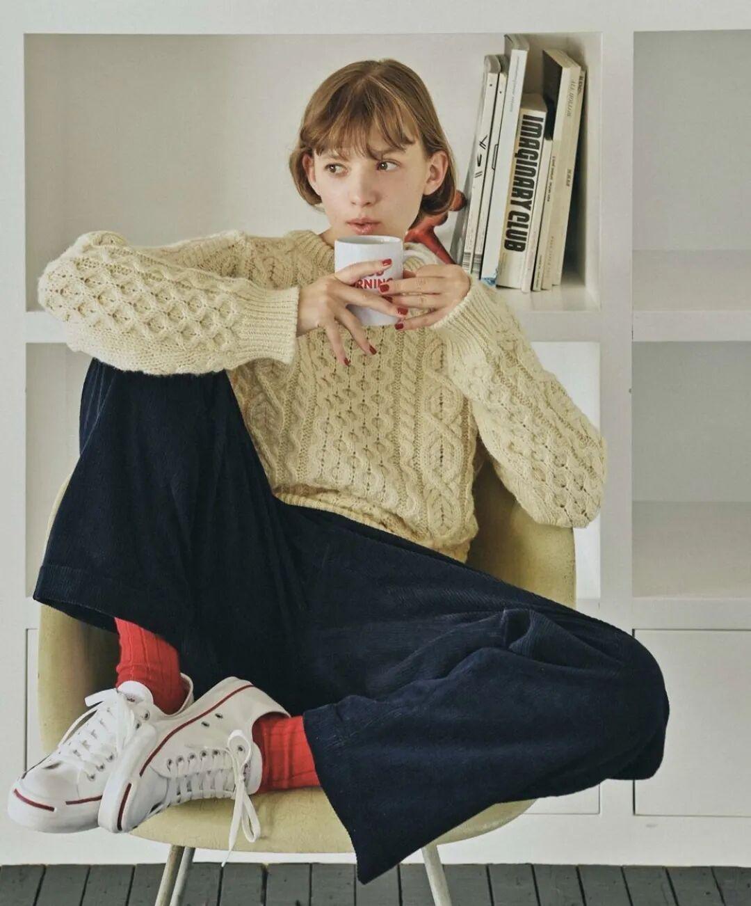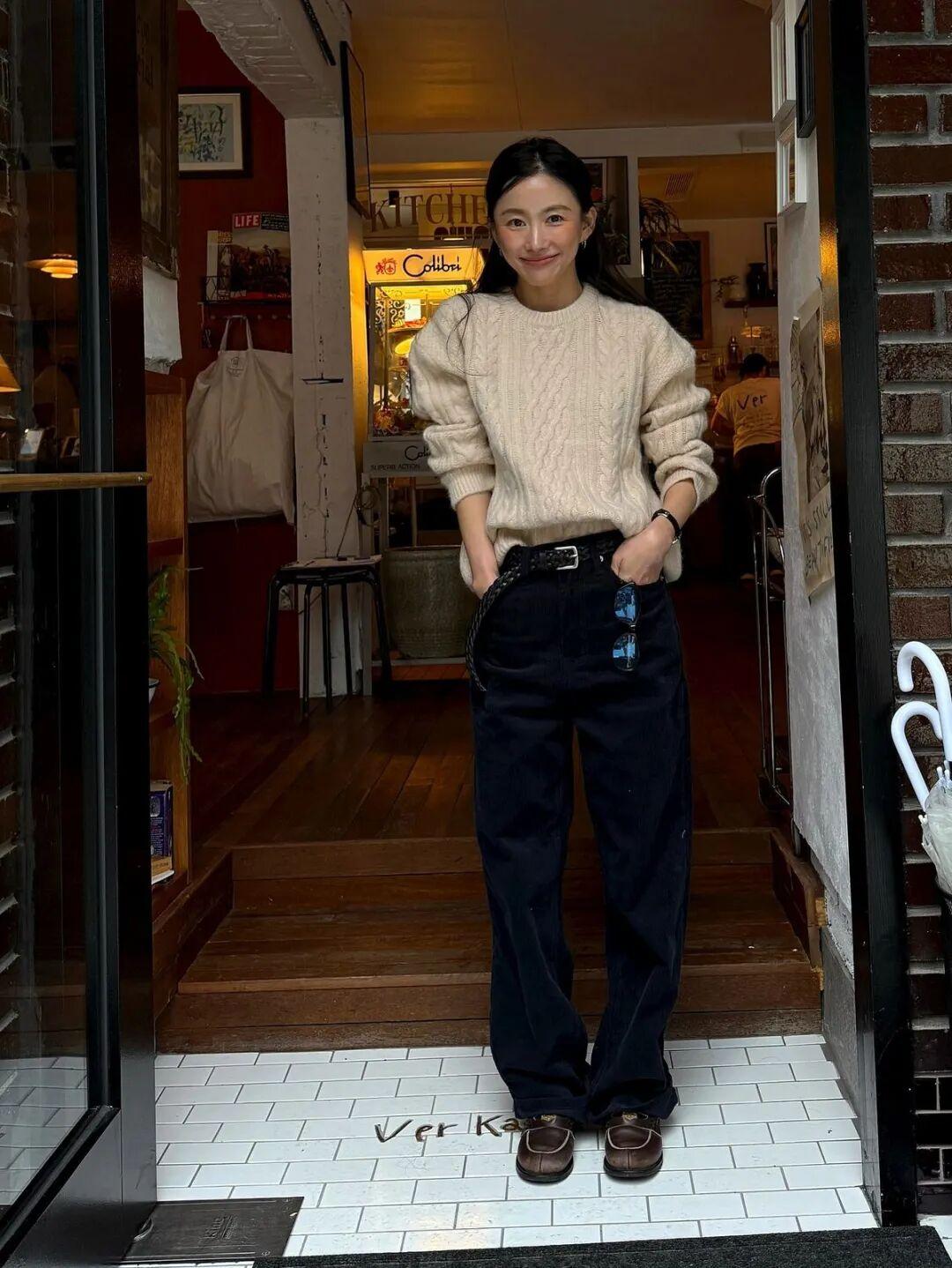 燈芯絨材質同樣是絞花毛衣的好夥伴,一起搭配是復古溫暖的冬日氛圍感。▼