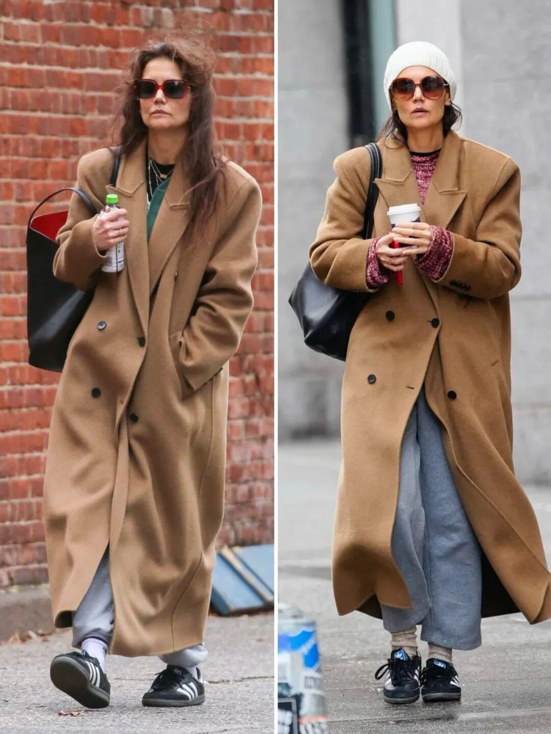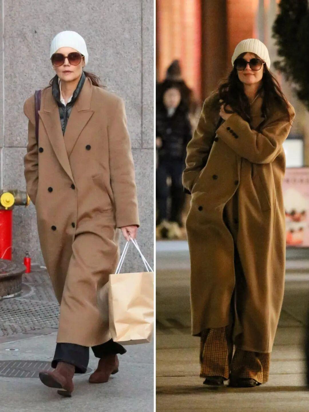 2023年末開始,凱蒂·霍爾姆斯(Katie Holmes)的秋冬穿搭裏就高頻出現這件3500元的駝色大衣。▼