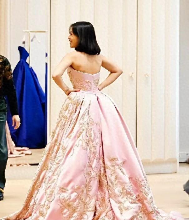王思蘊在巴黎舞會上選擇的英式玫紅色抹胸擺裙,是 “優雅與氣場” 的完美融合。紫紅色自帶 “正宮範兒”,既不像正紅色那般張揚,又比粉色多了份沉穩。
