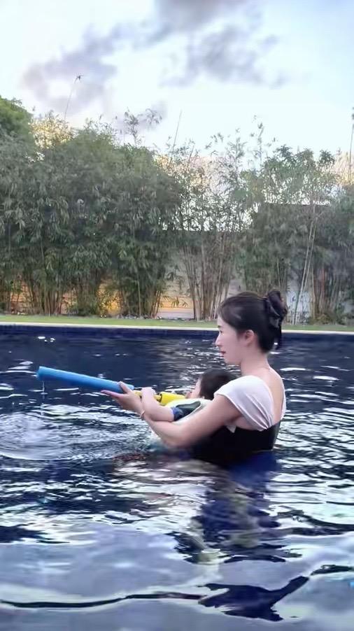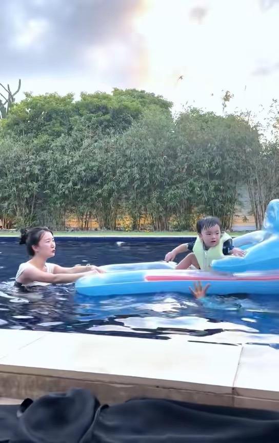 最讓人意外的就是李念的三胎兒子也出鏡了,在李念的豪宅裏有大大的用泳池,她經常帶着三胎兒子在游泳池裏的玩水。