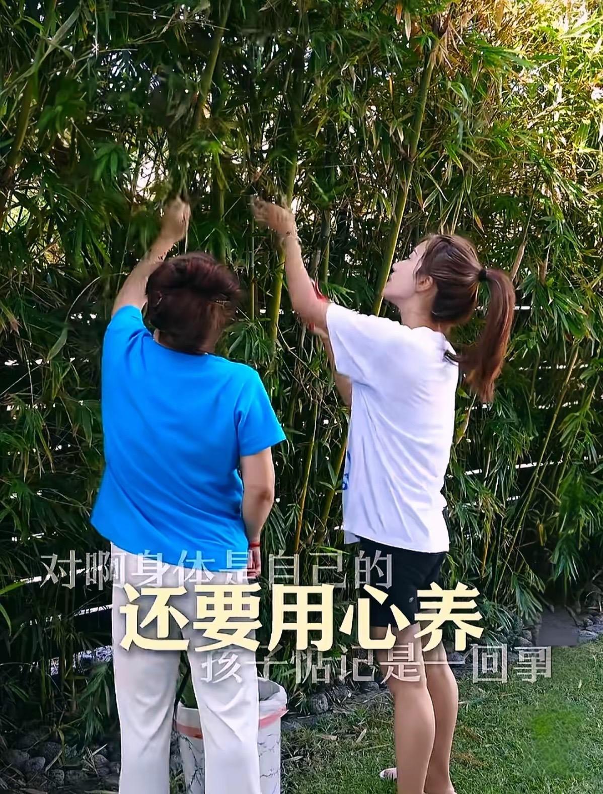 每天都有固定的做操時間,李念媽媽穿着藍色中式上衣、白色闊腿褲,簡簡單單的就很大方。李念穿白色字母印花T恤、瑜伽短褲,她的身材還是那麼苗條,扎高馬尾看着很年輕。