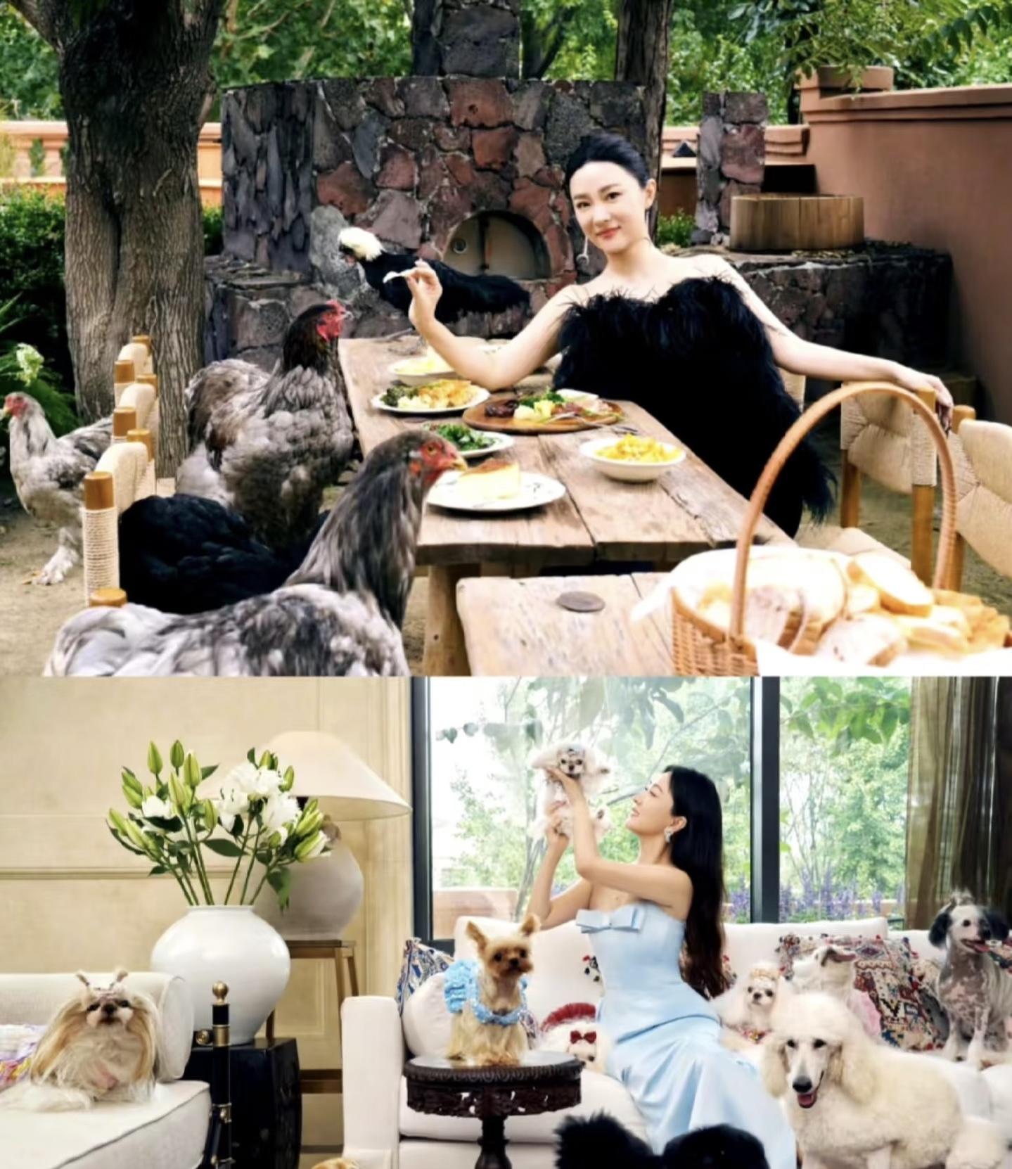 在她的豪宅裏,有很多動物。她的狗狗們都是可以自由的在沙發上、牀上穿梭的。甚至養的雞也可以爬上桌子,和她共進午餐。
