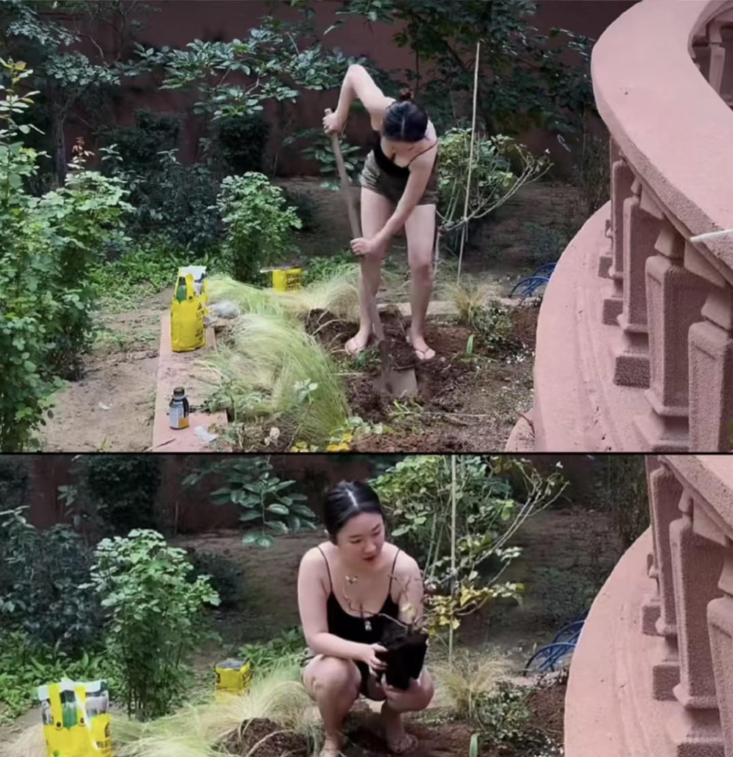 明明那麼漂亮明豔的女人,也可以俺麼接地氣。她光着腳丫、穿着短褲在豪宅裏刨地,這個模樣真是太接地氣了。