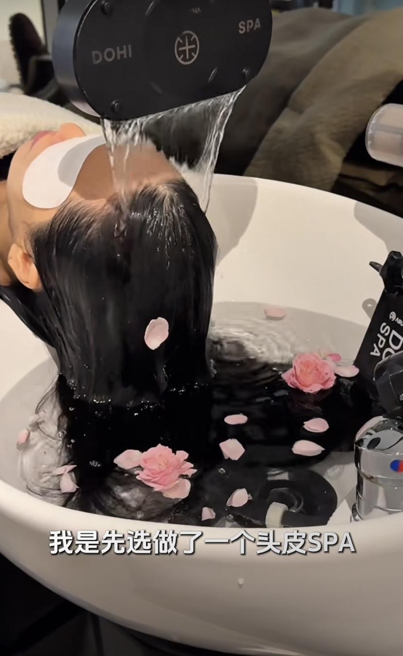 先給頭皮做一個Spa,讓頭皮得到舒緩和放鬆。其實明星的工作也很忙,她們難得有時間休息,做一個頭部spa就是自己的修養身心的時刻。