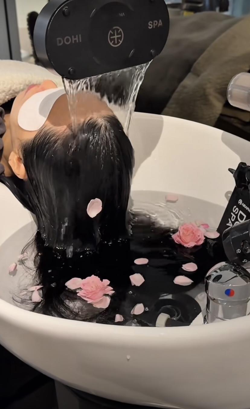 剪頭髮之前,還是先給頭部做一個spar,伊能靜說這樣的玫瑰花水洗頭髮很舒服。只能說韓女太懂了,剪個頭髮都能營造出這麼浪漫的氛圍。