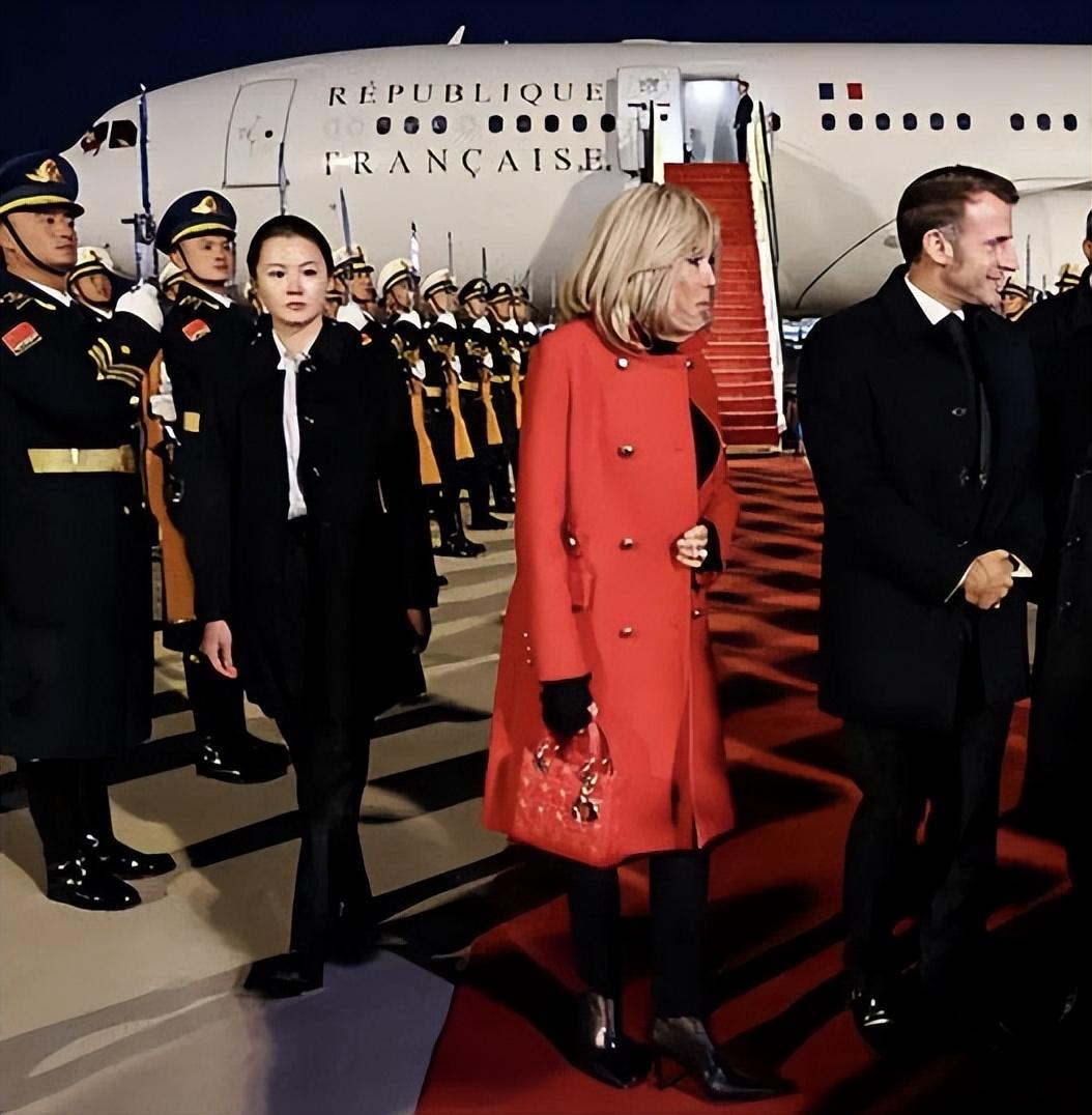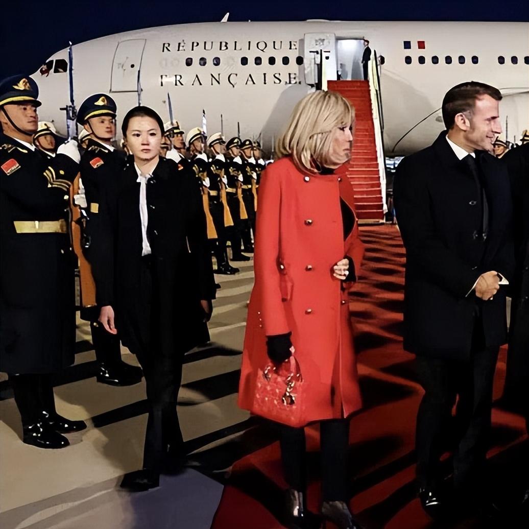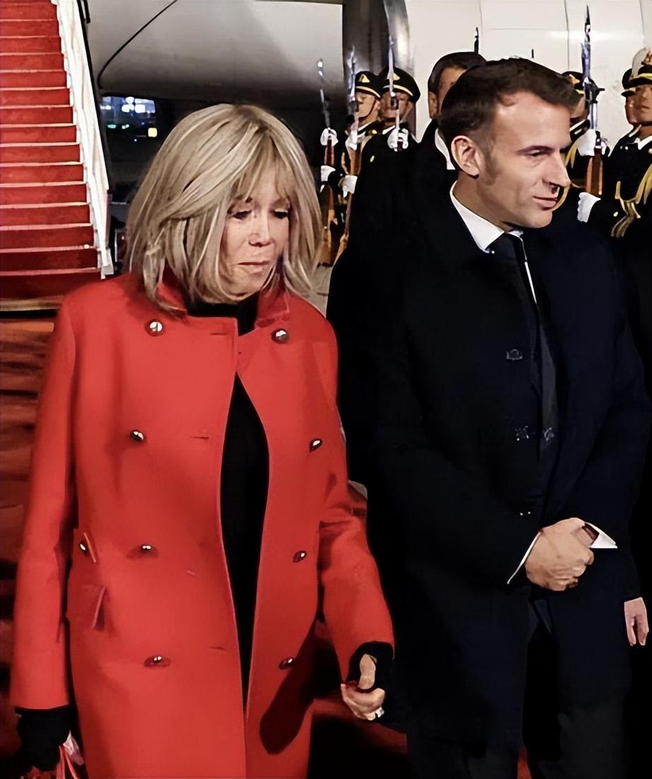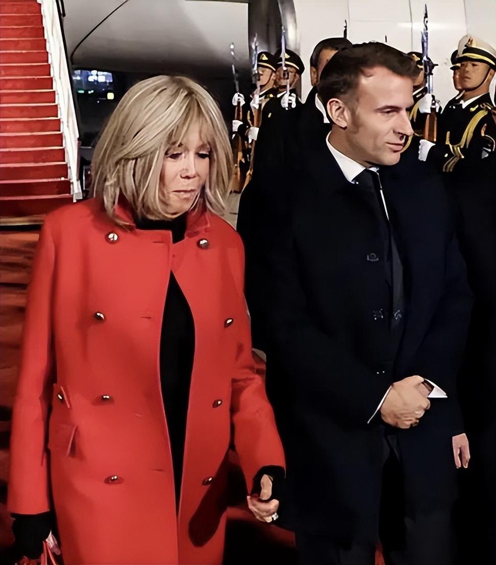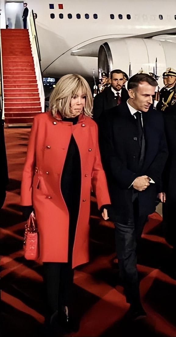 馬克龍帶着老婆訪華,布里吉特也是認真打扮了一番。她穿一身中國紅、配着高跟鞋,精緻優雅摩登貴氣。