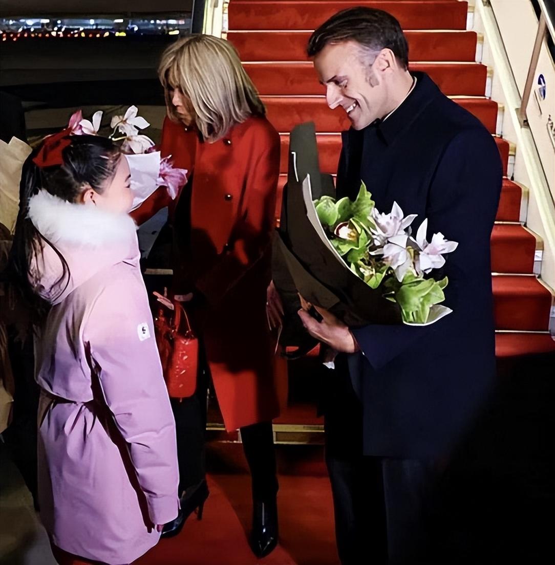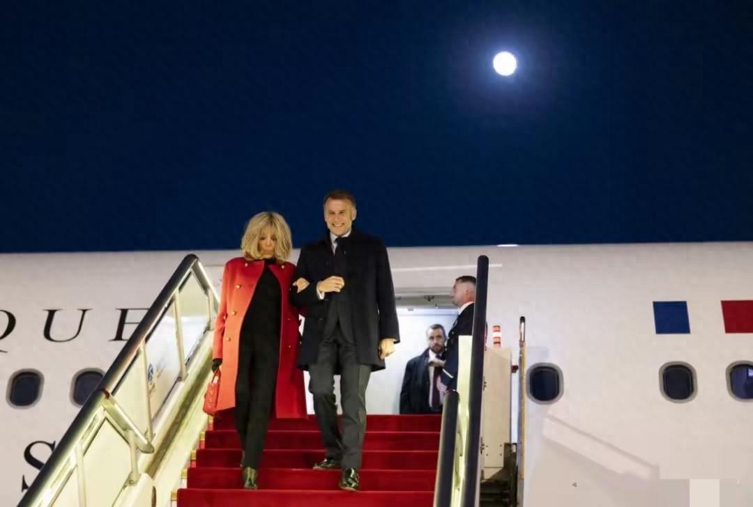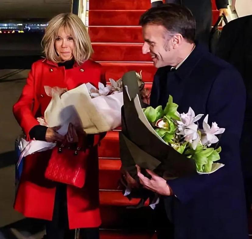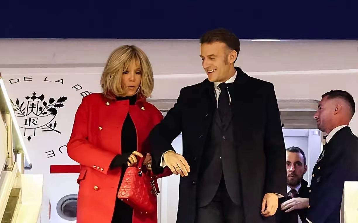 下飛機的時候,這一幕也是特別的有愛。馬克龍滿臉笑意,主動伸出胳膊、讓老婆挽着。布里吉特手裏拿着戴妃包,輕輕地挽住了老公的胳膊。