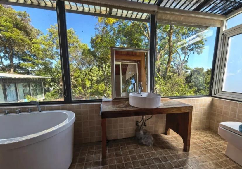 房子做了玻璃頂,可以看到藍藍的天空、外面是鬱鬱蔥蔥的樹木,住在這裏心曠神怡。衛生間的位置安裝了大浴缸、邊泡澡邊欣賞美景。