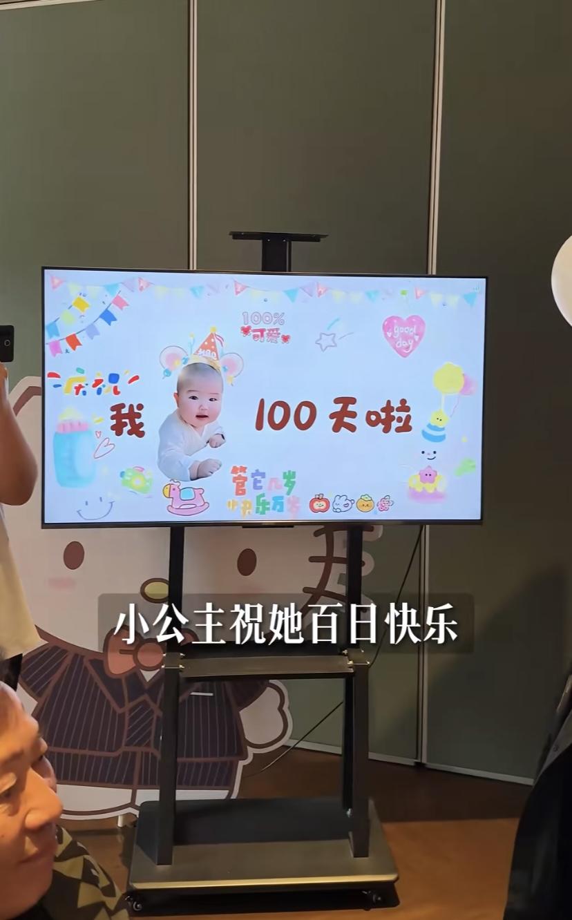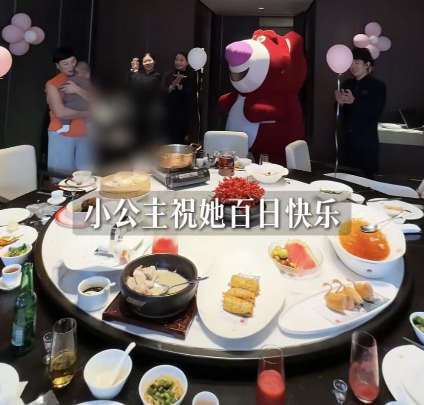酒店安排了電子屏,上面是甜酒的照片,還用粉色氣球佈置了一下。甜酒才100天,沒必要大肆操辦、但該有的儀式感都不會少。這就是父母對孩子的愛,不管孩子懂不懂、該有的都會有。