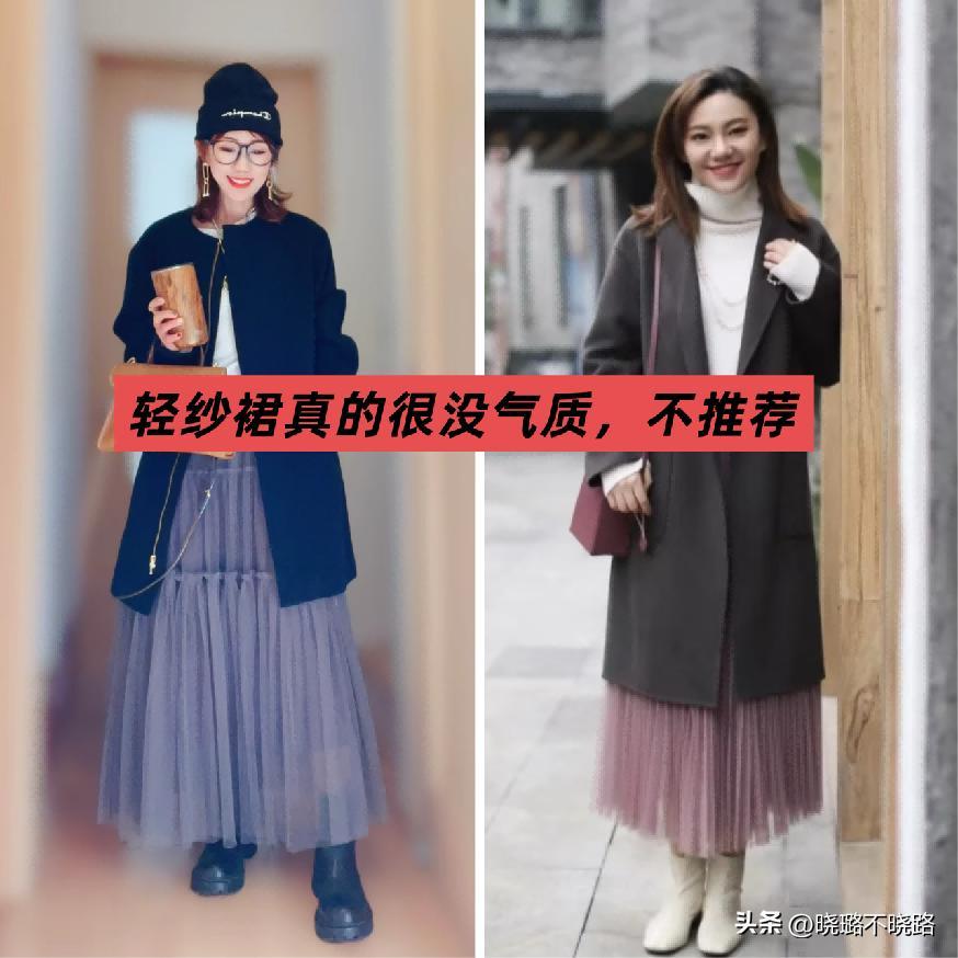 好像就會有不少的女性在到了中年階段的時候,就會比較喜歡搭配一些輕紗材質的裙子,但是要在這裏告訴各位女性的是,如果你要穿大衣的話,那麼這樣的系列單品千萬不要選擇將其進行運用了。因爲它本身所襯托出來的身材狀態是沒有任何的輪廓走向的明朗性又或者是氣質襯托的,尤其是和大衣搭配起來的時候能夠給人一種很明顯的臃腫感。