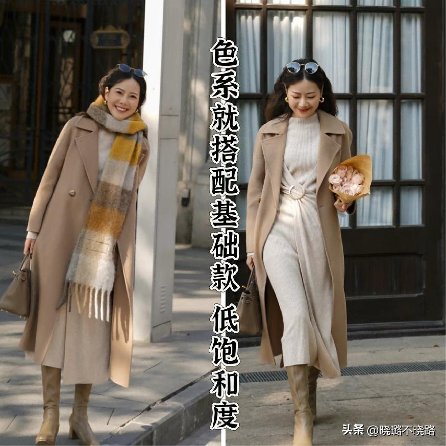也推薦大家可以首選運用基礎色,又或者是飽和度較低一些的顏色,這樣的裙裝所襯托出來的高級感和穩定度會比較高一些,尤其是與基礎色系的長款大衣在進行疊穿的時候又優雅又溫柔,這對於五六十歲這個年齡階段的女性來說,可以說是非常極具優勢的穿搭。