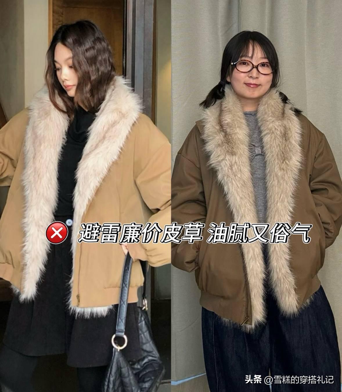 市面上就有很多劣質的皮草外套,容易掉毛、質感差、味道重,看模特圖穿時髦顯貴,但是穿在自己身上,簡直就是“油膩重災區”,分分鐘變成“熊大”。