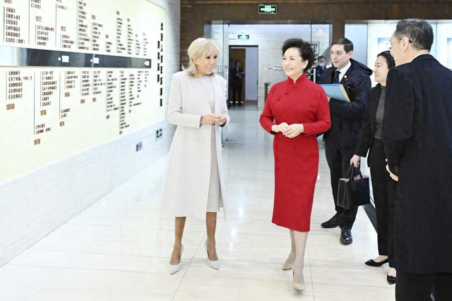這身造型恰如 “硃紅一點透春寒”,既表達了對中國文化的尊重,又彰顯了法國第一夫人的時尚底氣。