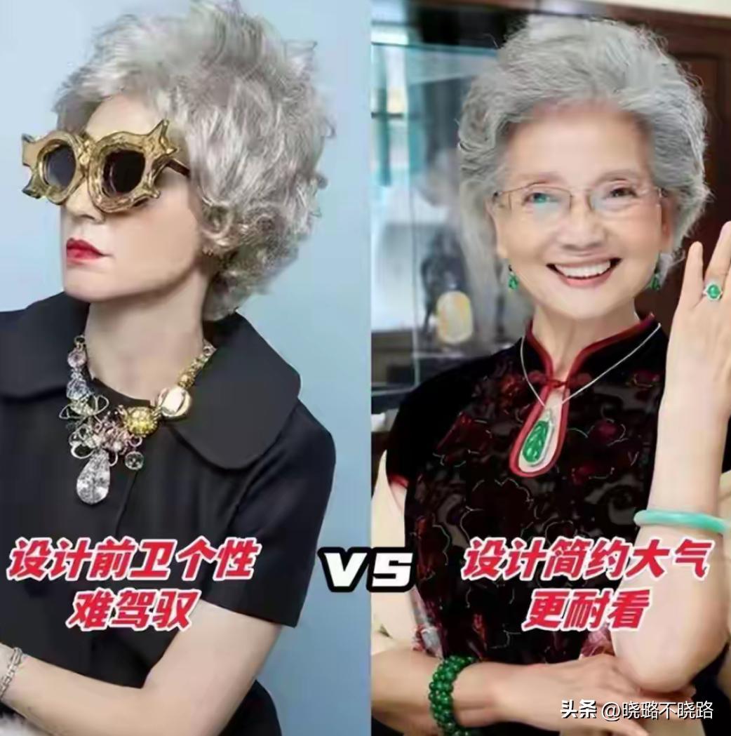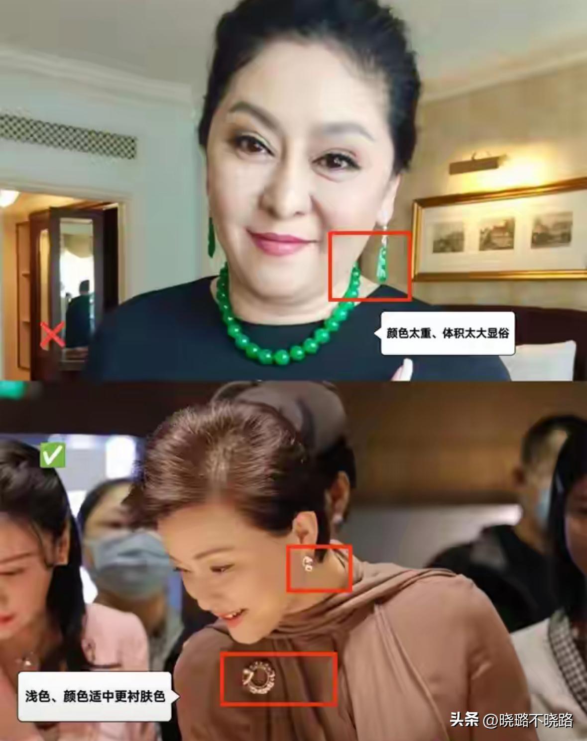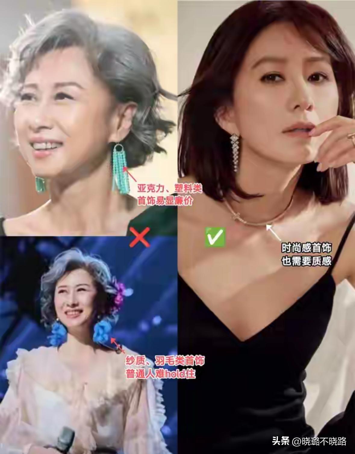 再從首飾的材質進行出發,你會發現,現實生活當中,很多中老年女人都喜歡戴廉價的亞克力、塑料類、羽毛類、紗質首飾,分分鐘就會拉低造型的檔次。