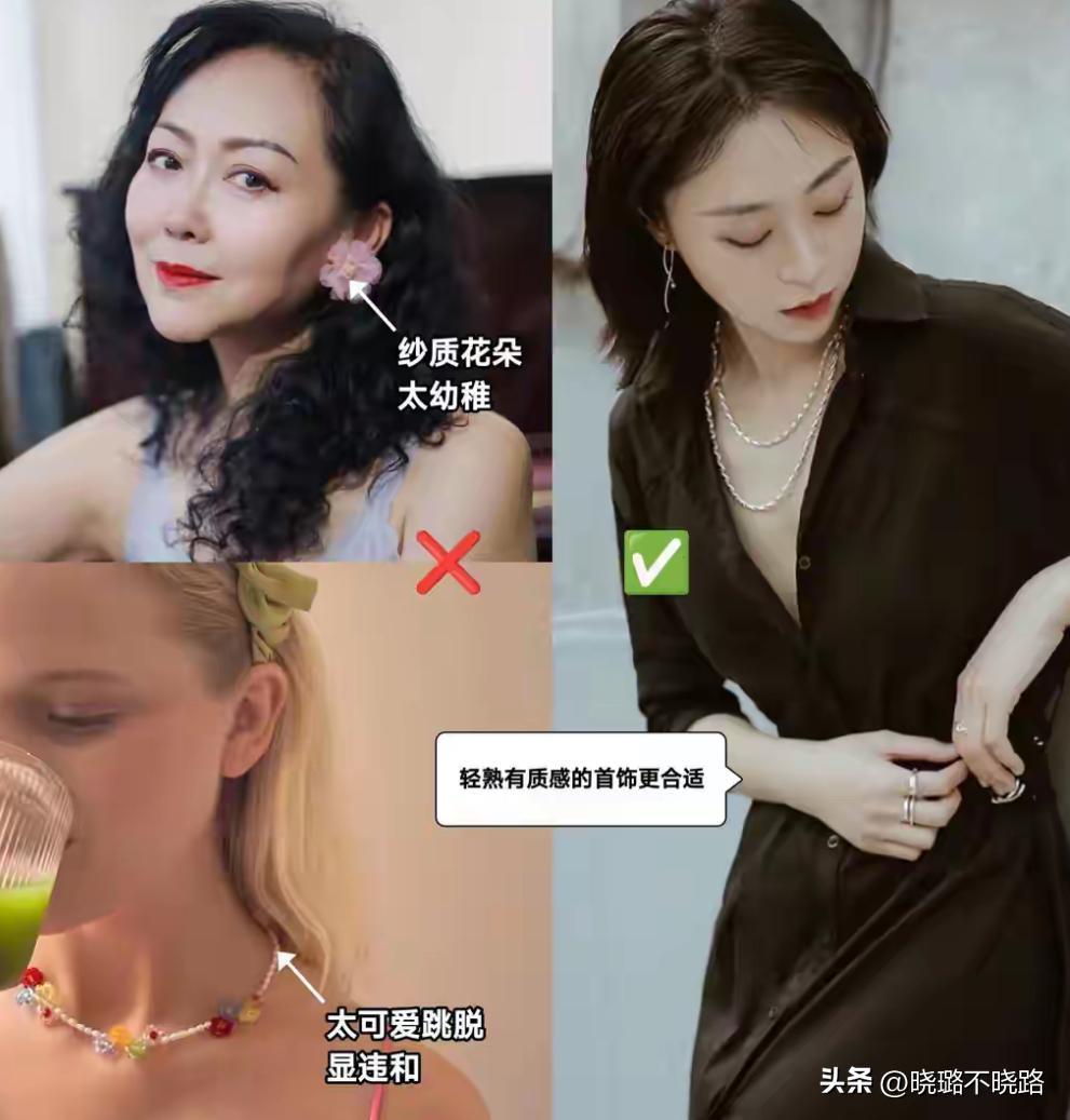 相比之下,像一些體積過大、顏色飽和度高的首飾,就很容易加重年齡感,戴在身上還會搶風頭,很難和服裝形成平衡,所以大家一定要學會遠離!
