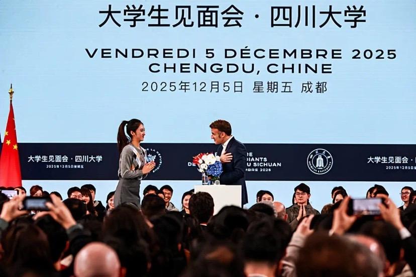 在四川大學的見面會上,馬克龍還上臺演講了。他穿一身西服套裝,侃侃而談的模樣很有魅力,給他鮮花的小姐姐氣質也超好。