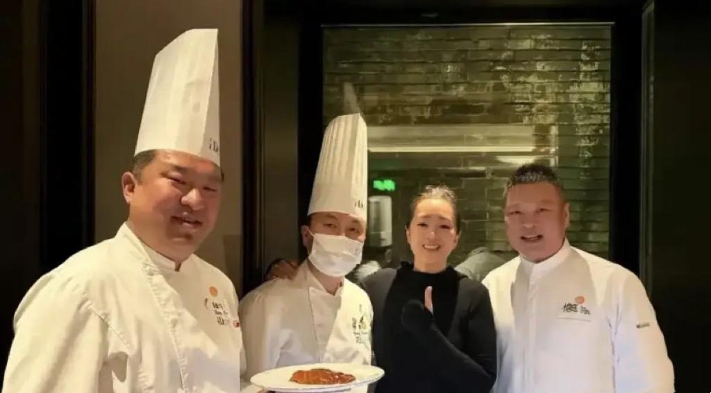 和以往在紅毯上的強勢霸氣不同,私下裏的鞏俐很平和。她摟着大廚的脖子拍照,就像是鄰家姐姐一樣溫和。
