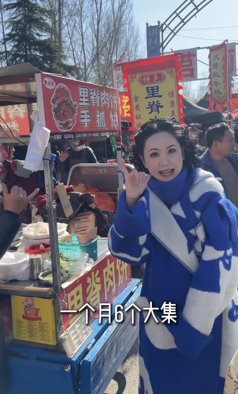 農村大集上的小喫,也都是熱氣騰騰的。程莉莎非常接地氣,站在寒風裏喫着肉夾饃,手裏還拿着一個奧爾良雞翅。