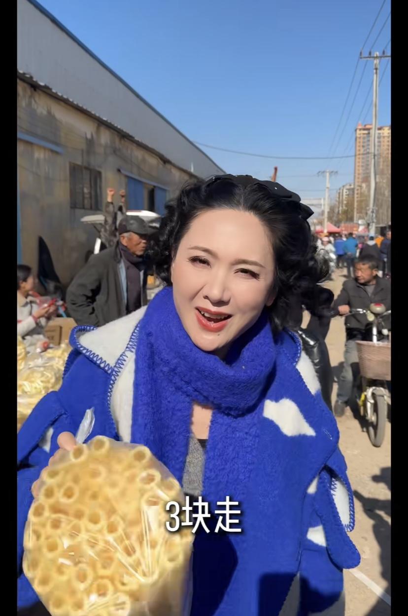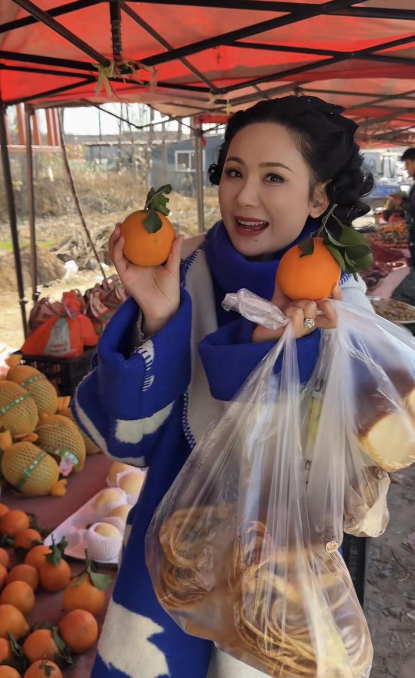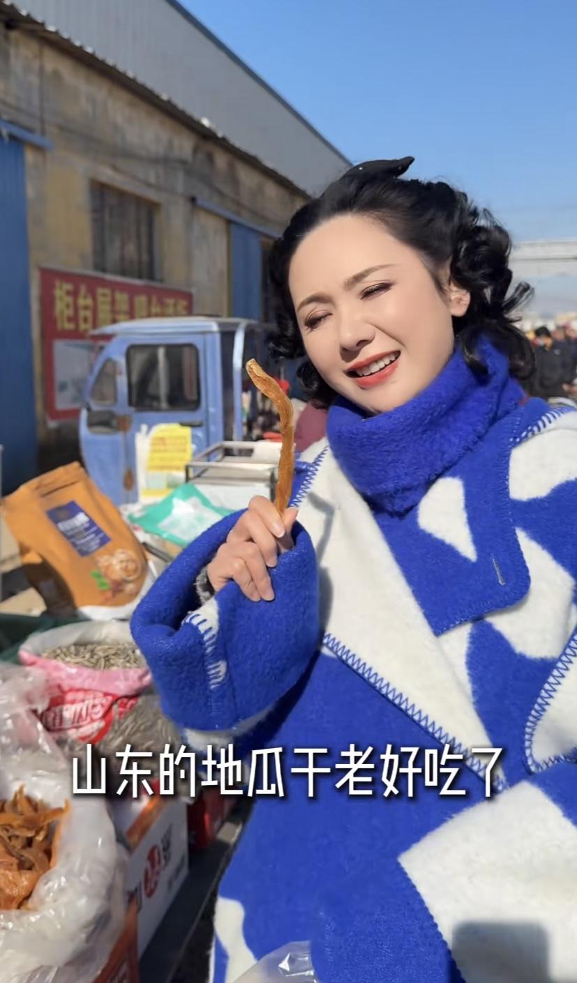農村大集,真的非常有煙火氣。程莉莎走在賣乾果的攤販前,隨手拿起地瓜幹就嚐了一口。她說山東的地瓜幹老好喫了,不愧是山東媳婦、對山東的一切都是那麼熱愛。