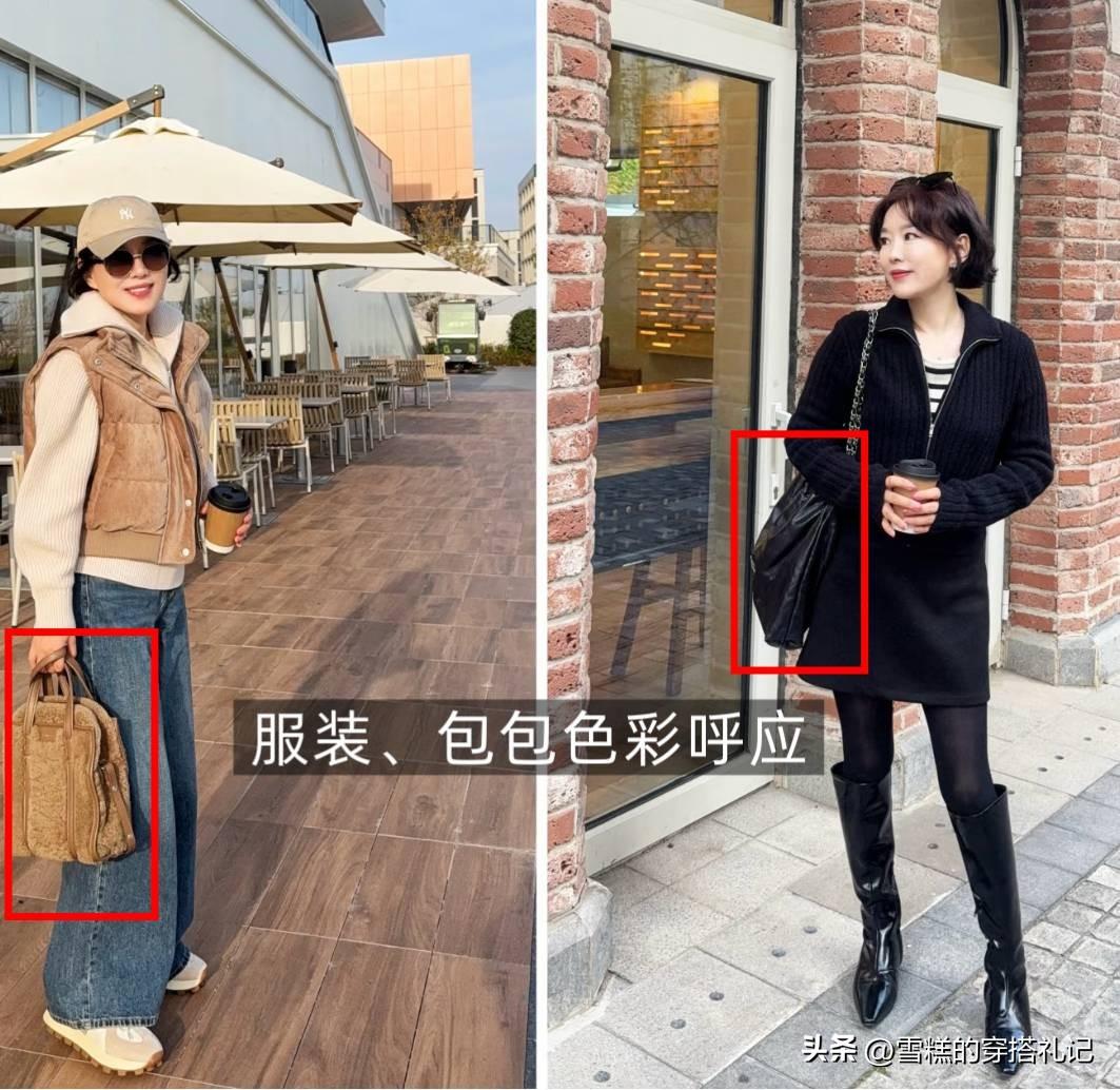 服裝和包包行程色彩呼應的關係,材質上就要製造“矛盾美學”,例如羊絨材質+皮革材質,軟硬兼施“剛柔並濟”,盡顯平衡感,如果整體顏色都很基礎簡約,建議可以備一款亮色包包,突出吸睛點。