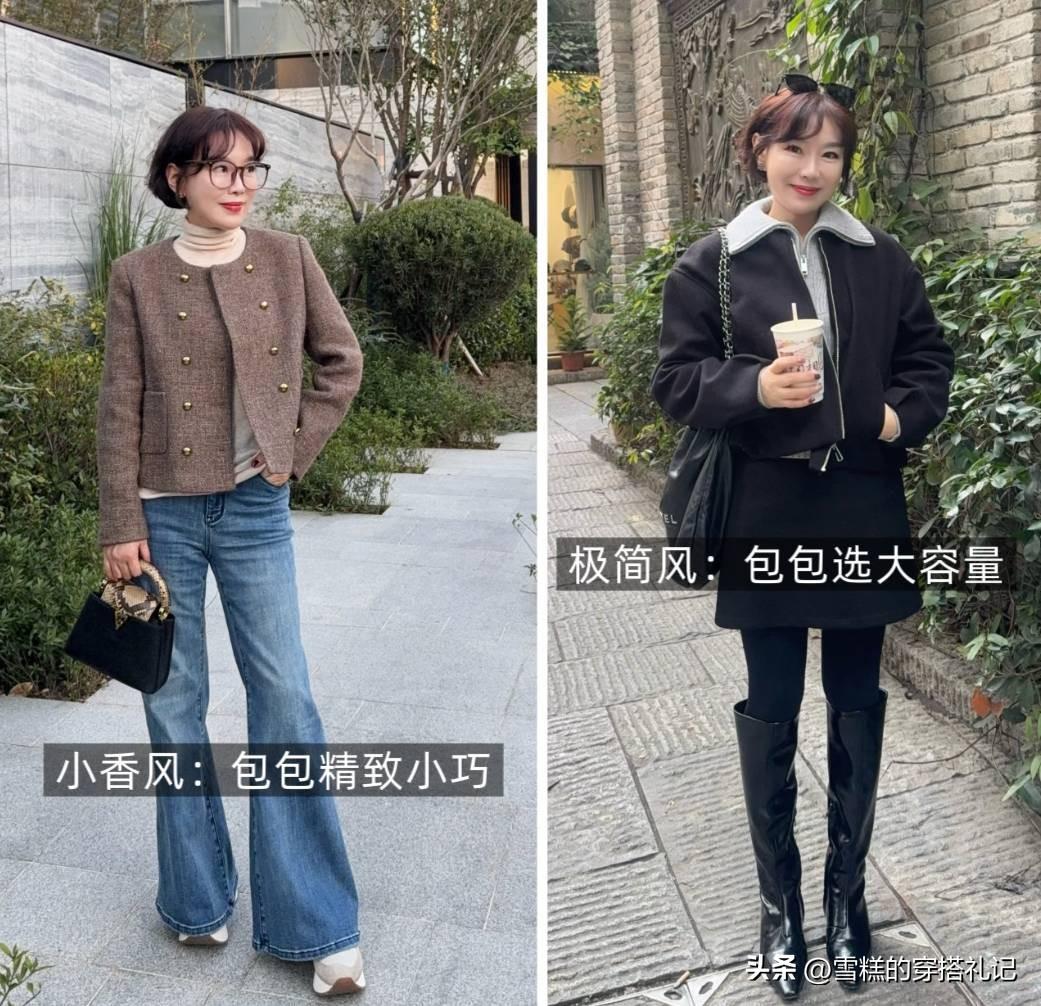 穿衣風格不同,所挑選的包包大小,也會有所差距,例如小香風的穿搭,不適合背太包,換成精緻小巧型的手提包、鏈條包,適配度更高。