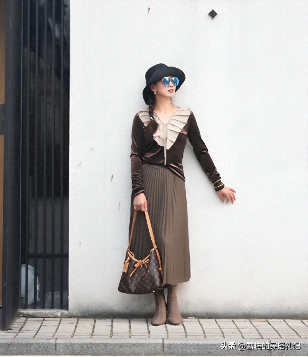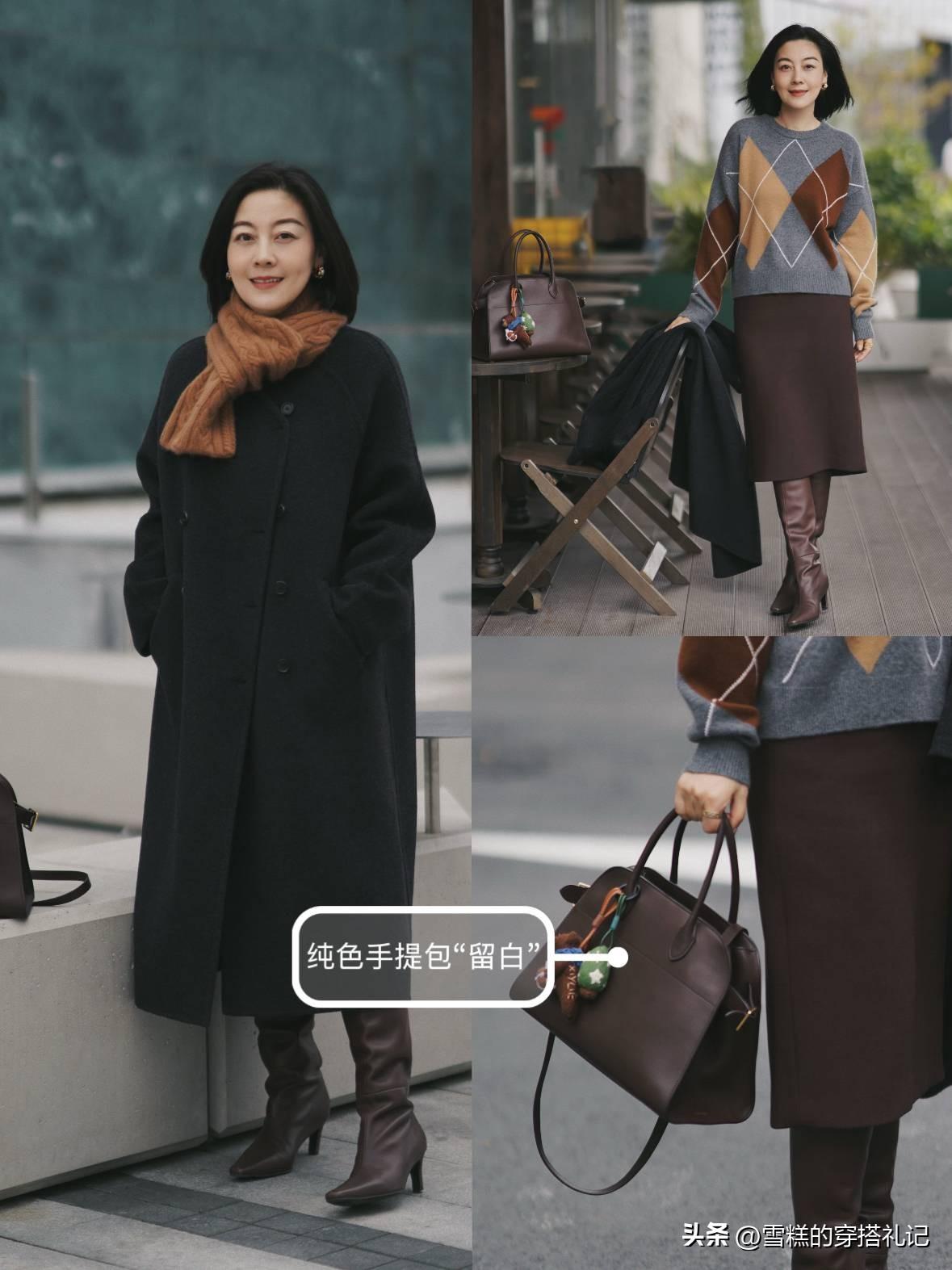 真正有智慧的女人,往往都懂的給穿搭“留白”,所以搭配的包包,通常會以純色爲主,而且還非常有質感,比如這款深棕色的手提包,面面俱到,讓人非常安心。