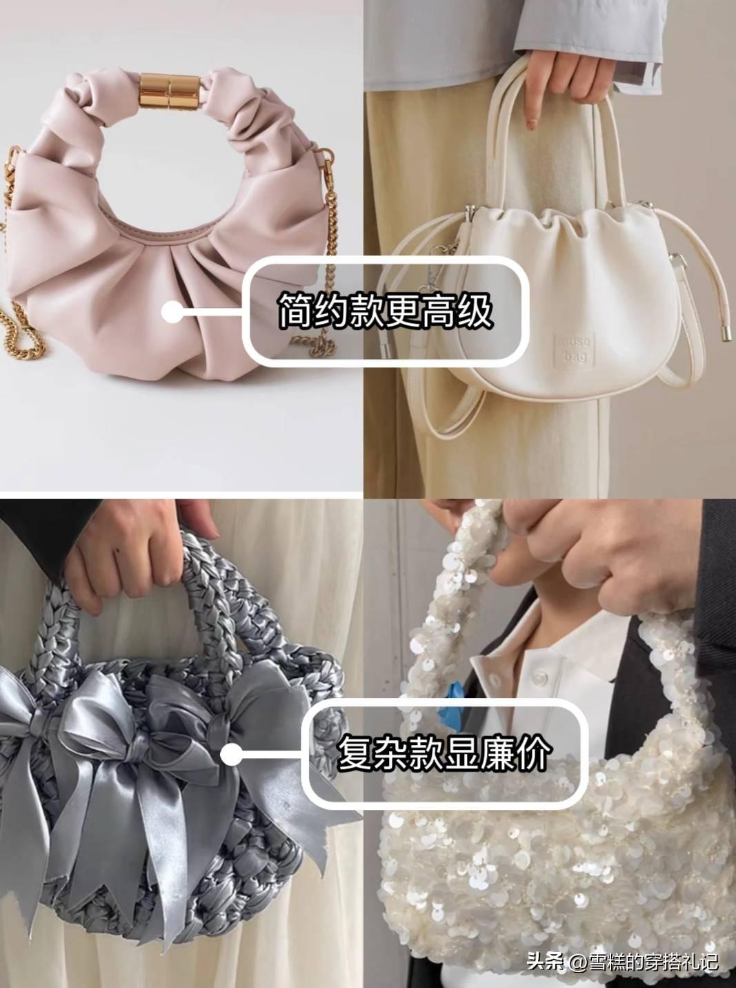 推薦大家換成設計簡約的雲朵包、馬鞍包、餃子包,加入1~2和設計點就夠了,比如捏褶設計、字母浮雕、燙金等等。