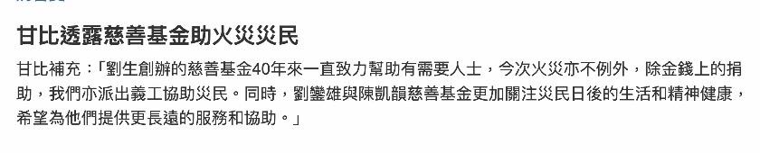 這次香港大火,不少人質疑劉鑾雄沒有捐款。甘比特意解釋,劉鑾雄創辦的慈善基金會一直致力於幫助有需要的人士。這次大火也不例外,除了金錢上的捐助,他們還派出一共幫助災民。