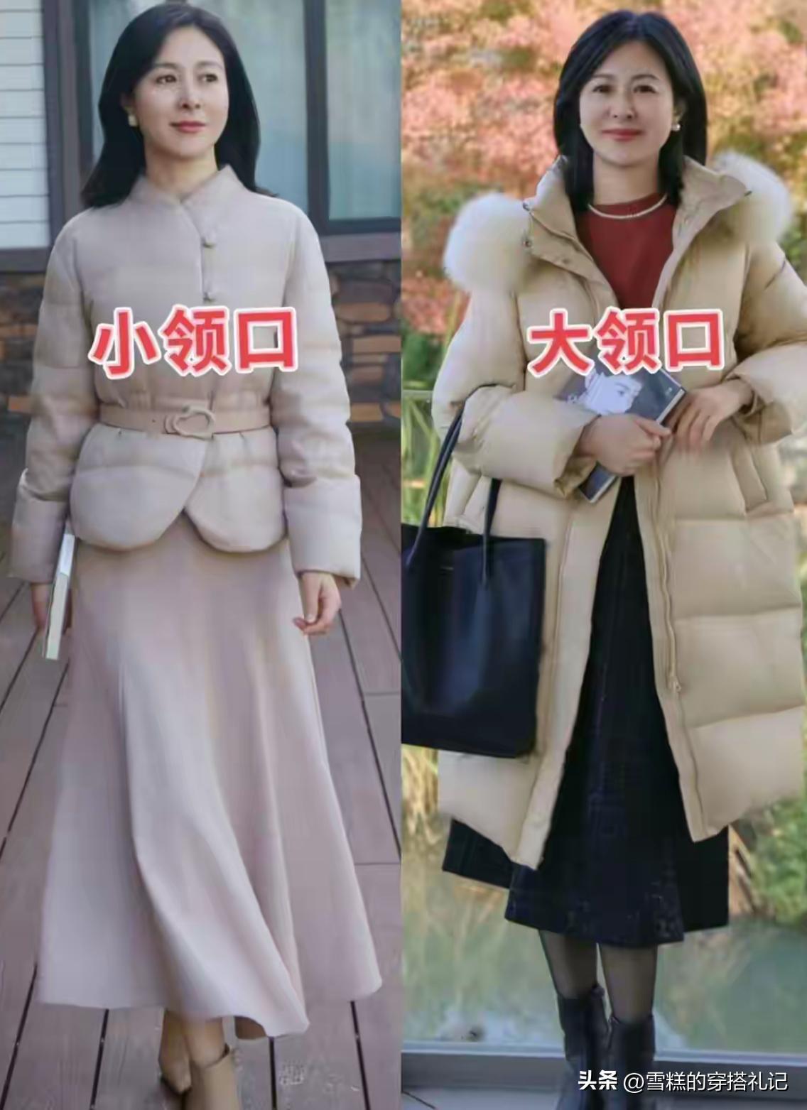 長款羽絨服,領子就不能太窄,大毛領、大翻領纔是“氣質殺手鐧”,輕輕鬆鬆將你的臉型襯托的更小巧,內搭可以露出脖頸,拉長頸部線條。