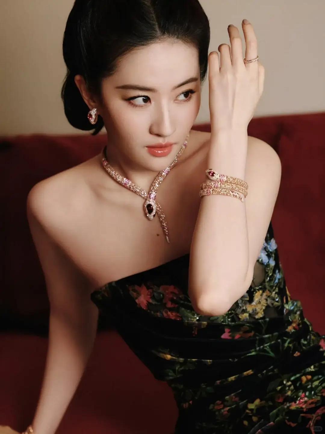 劉亦菲這次亮相,完全就是行走的珠寶展。耳環、項鍊、手鐲,層層疊疊,反倒是讓人忽略了她原本的美麗。