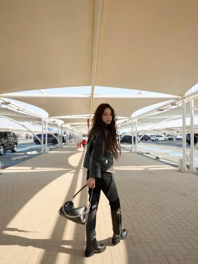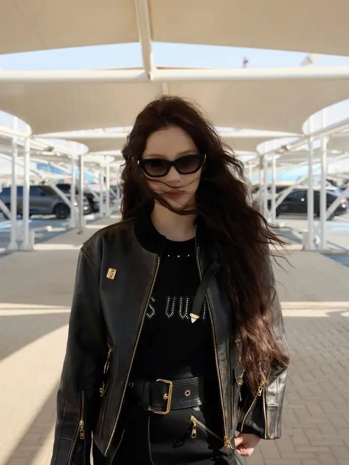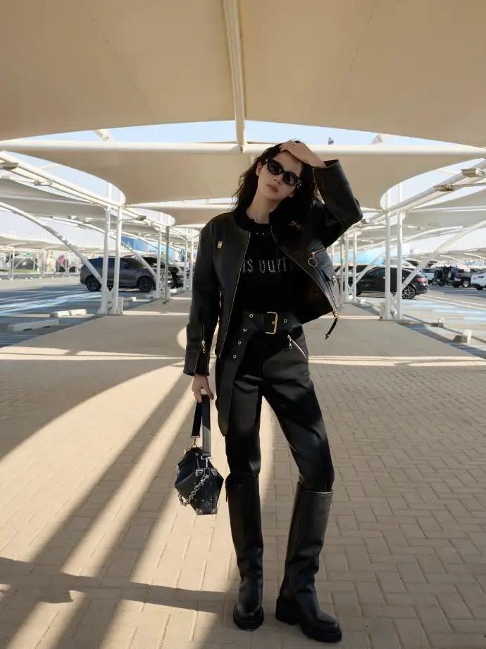 一頭羊毛卷、一件皮衣外套、修身小黑褲、騎士靴,這身打扮慵懶中帶着幾分颯美。機車風的造型,一臉漠然的狀態,美成全場焦點。