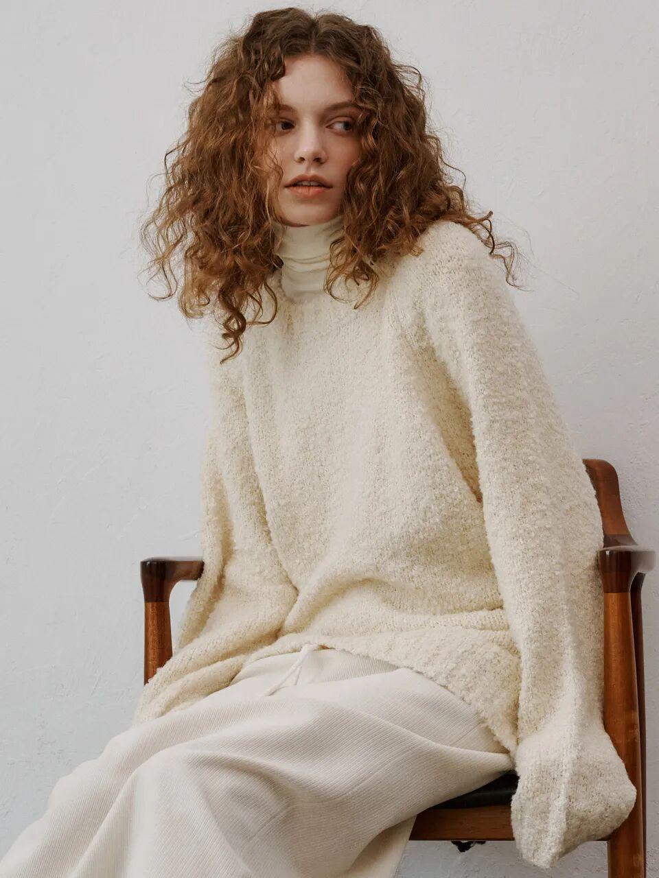 拉毛工藝的毛衣也可以考慮。最近拉毛針織單品特別火,衣服表面的毛毛像是給人附上了一層濾鏡,冬天穿很有氛圍感。▼