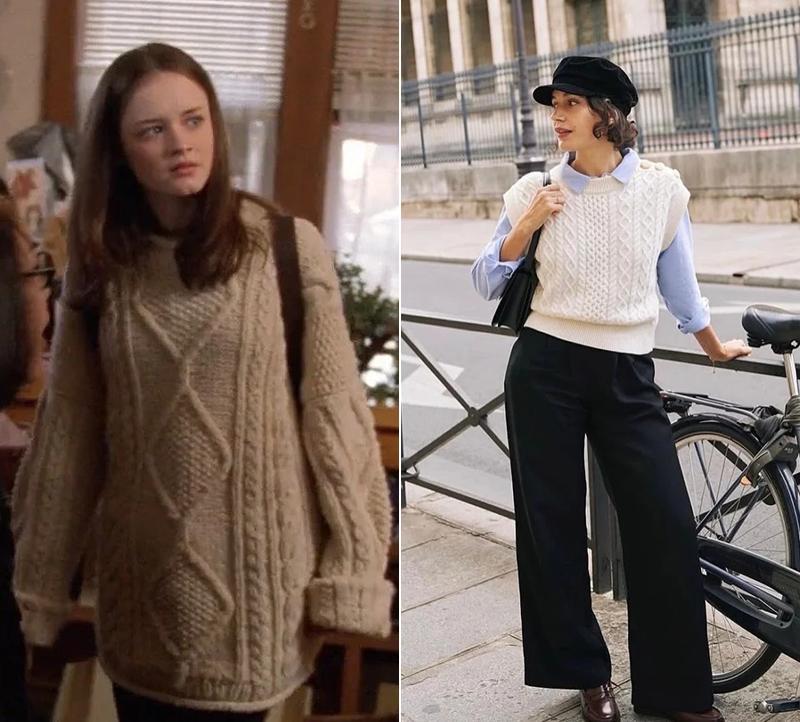 尤其不建議選擇面積過大的套頭粗針毛衣(左),很容易顯得笨重,遇上廓形差一點的更是災難。如果喜歡粗針的復古感,可以用短款背心做搭配(右)。▼