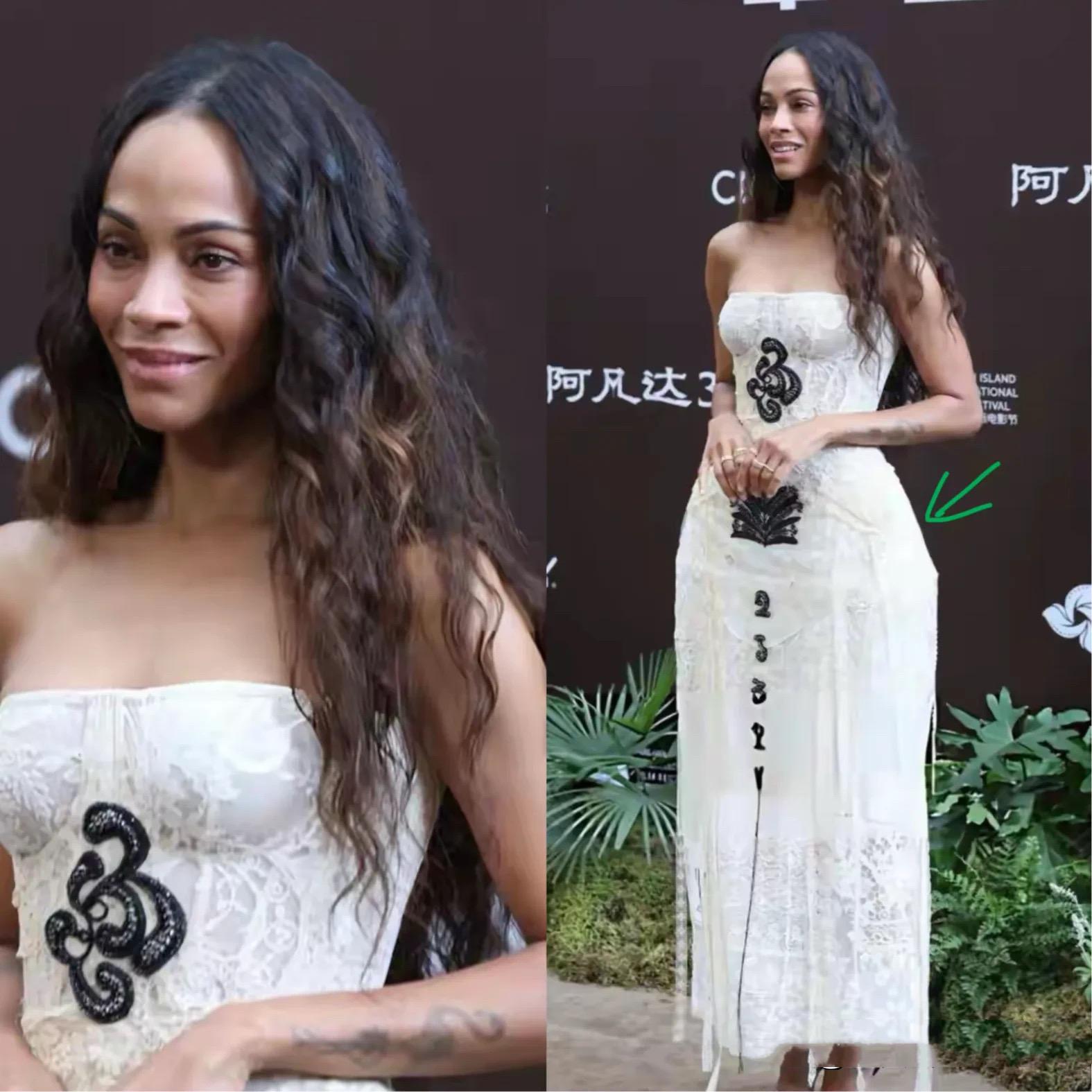 佐伊·索爾達娜作爲電影主演,穿一件白色抹胸裙亮相,她一頭泡麪卷的長髮,非常有辨識度。她是典型的小麥膚色,肌肉線條也很美。