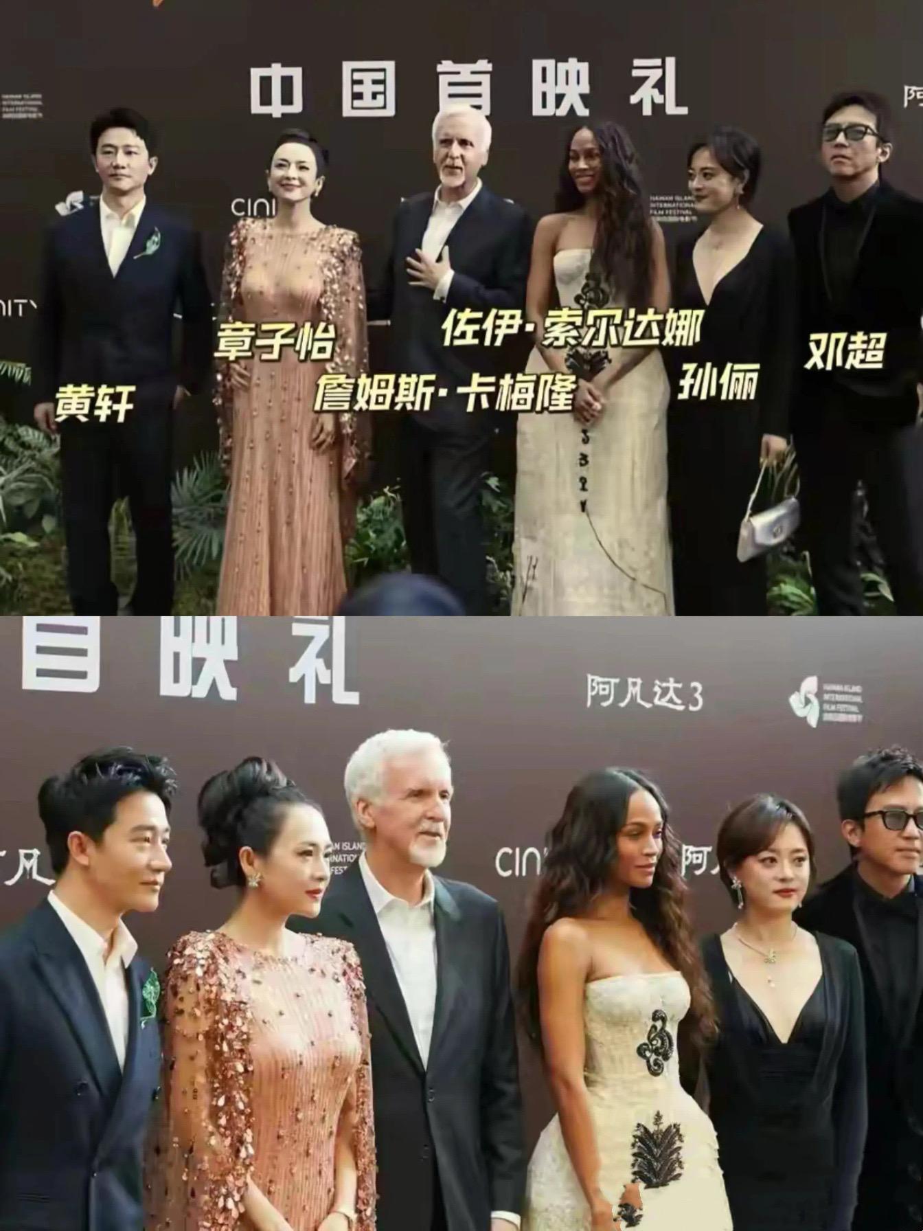 其實首映禮的現場,還有好多明星到場。比如導演詹姆斯·卡梅隆、主演佐伊·索爾達娜、中文配音章子怡、黃軒等都來了。