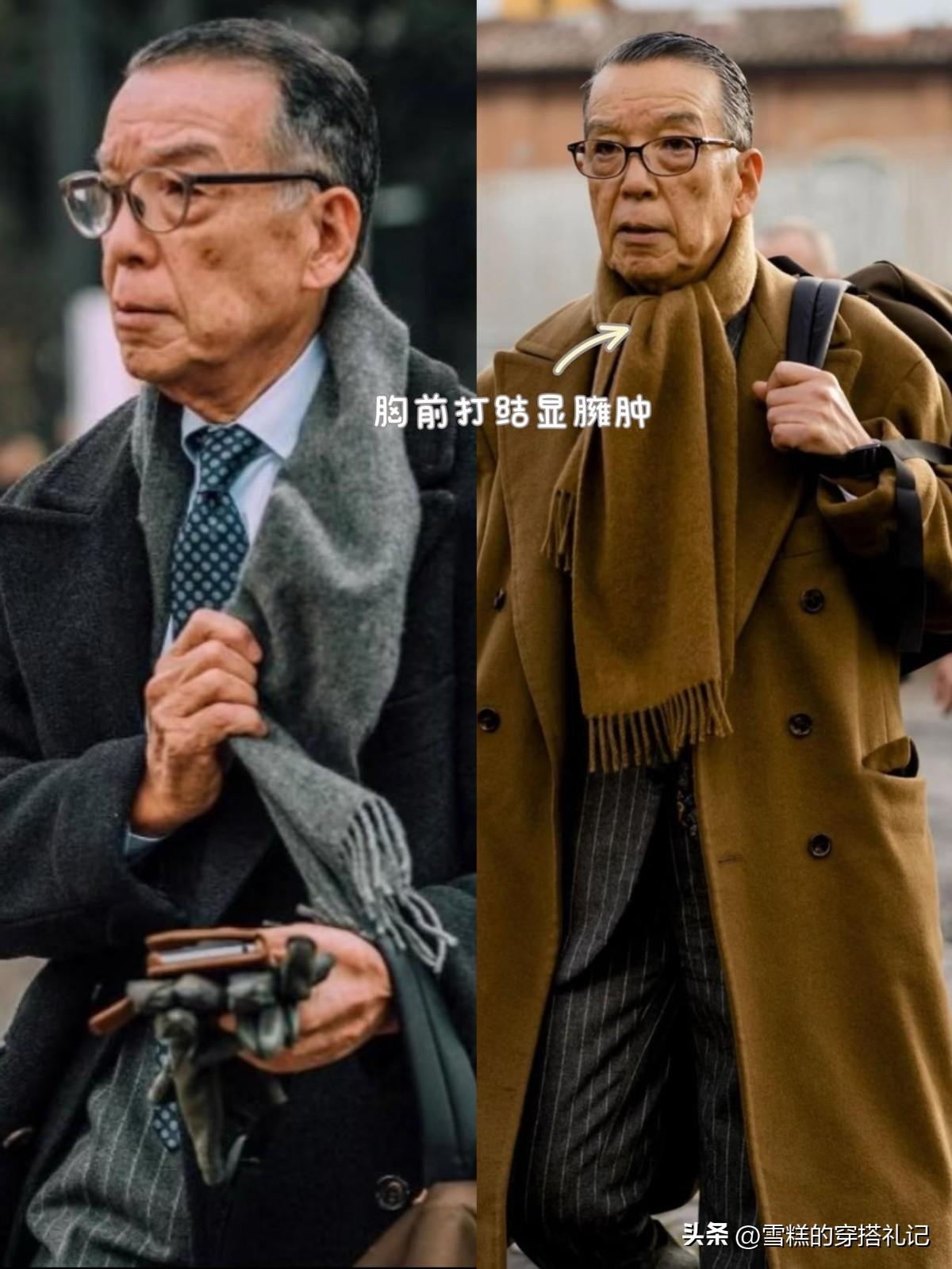 上海爺爺佩戴圍巾的時候,就特別注重“鬆弛感”,從不會把圍巾裹得太緊,要麼隨性的掛在脖子上,要麼會用最經典的對摺式系法,圍巾的尾端自然垂落於胸前,保暖又放鬆。