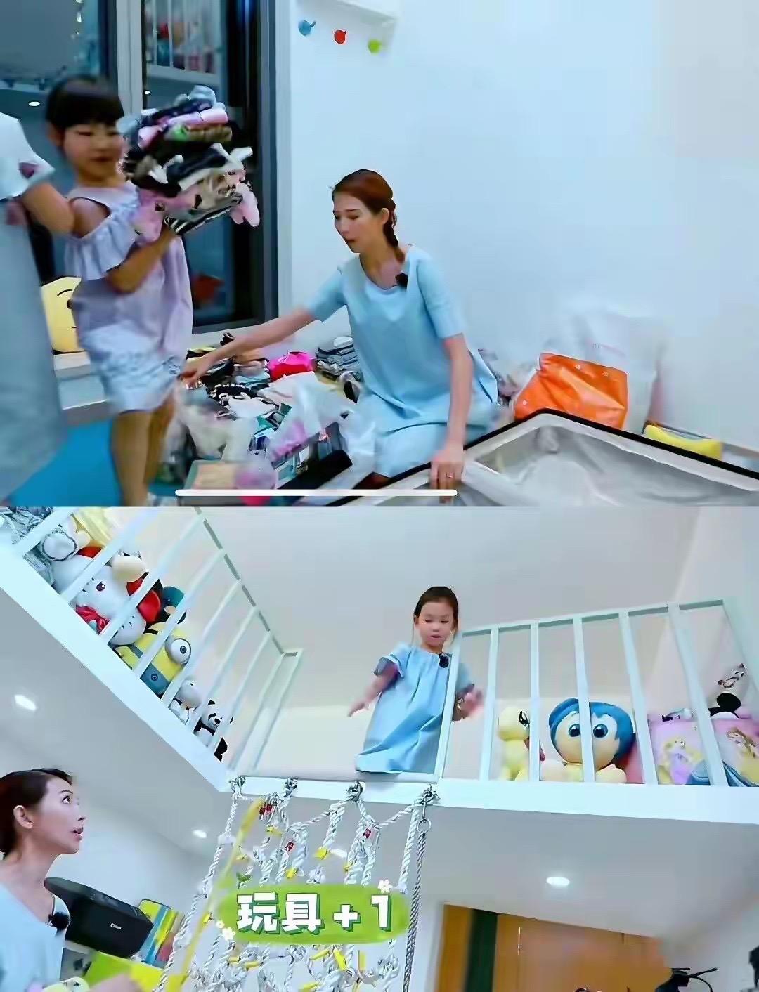 雖然房子小,但是家裏的東西卻不少。蔡少芬是女明星,各種服裝、禮服、高跟鞋都有一大堆。她平日裏喜歡打扮女兒,兩個女兒的衣服也不少。