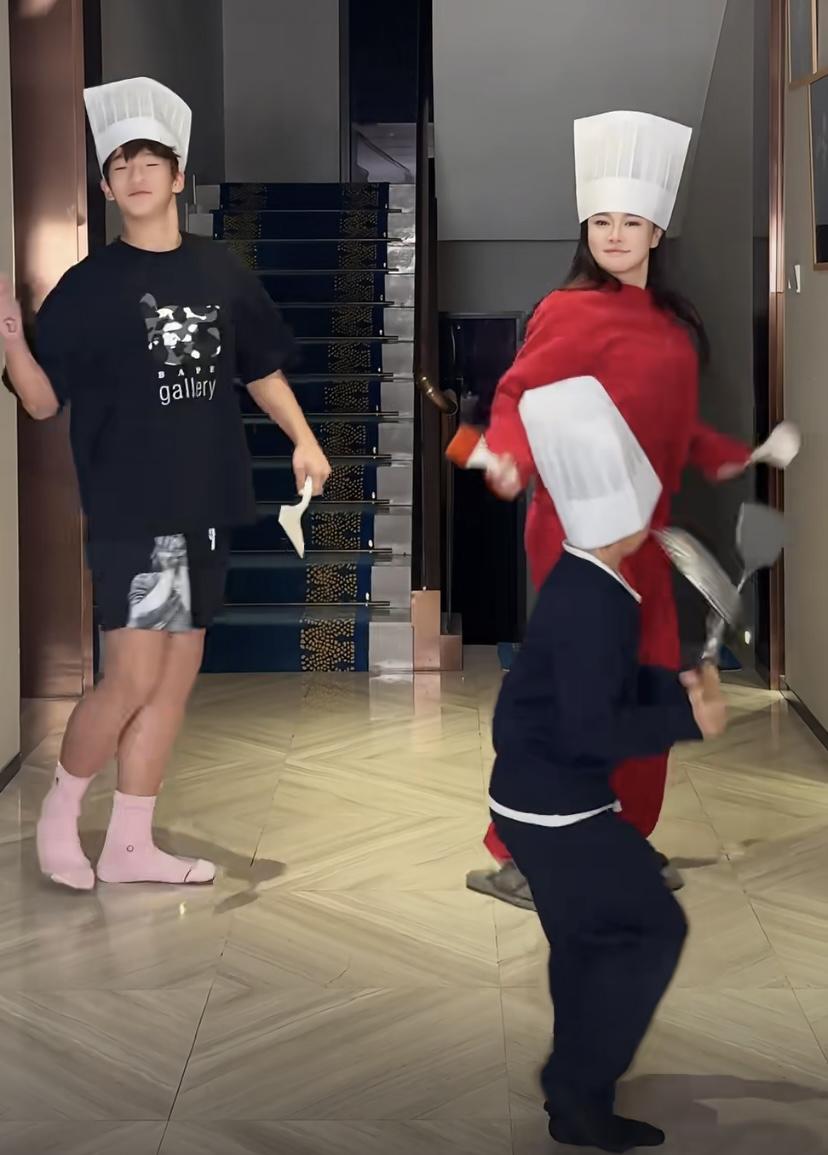 冉瑩穎下廚的時候,也會開心的手舞足蹈、並且一展歌喉。這時候大兒子鄒明軒就會在旁邊給媽媽撐場子,鄒明軒的身高快要超過170,單眼皮的胖軒長大後很帥氣。