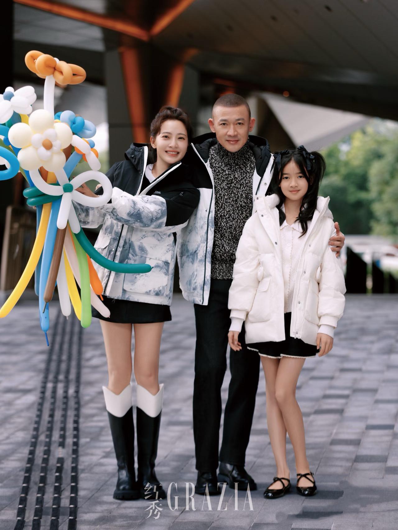 看着天天的個頭和媽媽差不多了,她穿白色羽絨服很清新。半扎發也特別俏皮可愛,聶遠摟着女兒和老婆,眼神裏都是幸福。