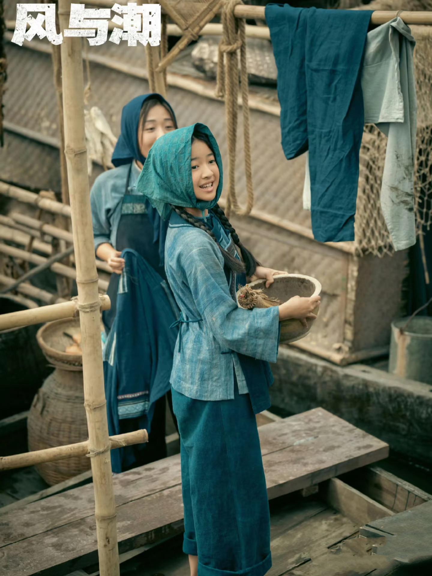 劇中的她穿一身藍色粗布衣裳,裹着頭巾、眼神裏都是靈動可愛,沒有任何突兀感。在《風與潮》中,天天飾演的小漁赤腳踩船、眼神倔強,也得到網友的一致好評。