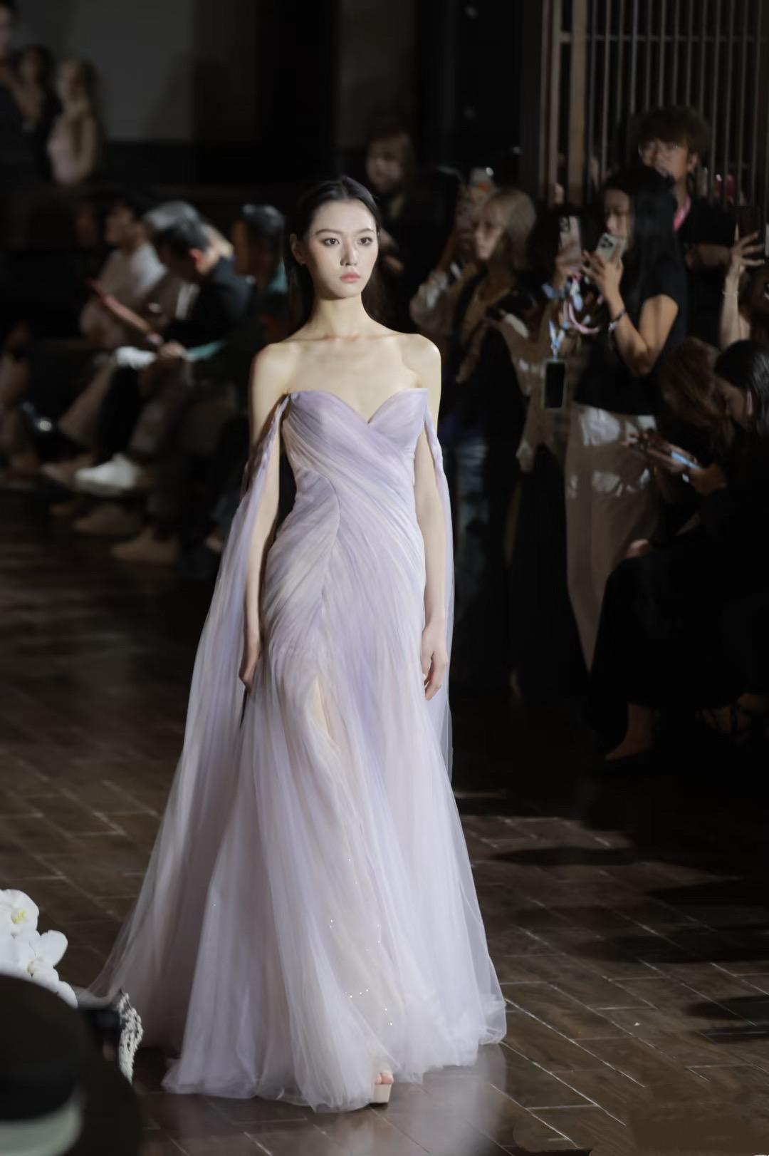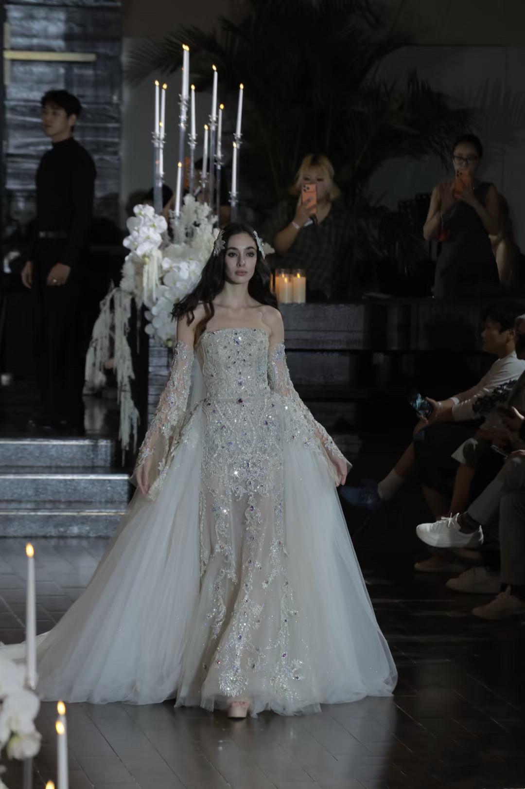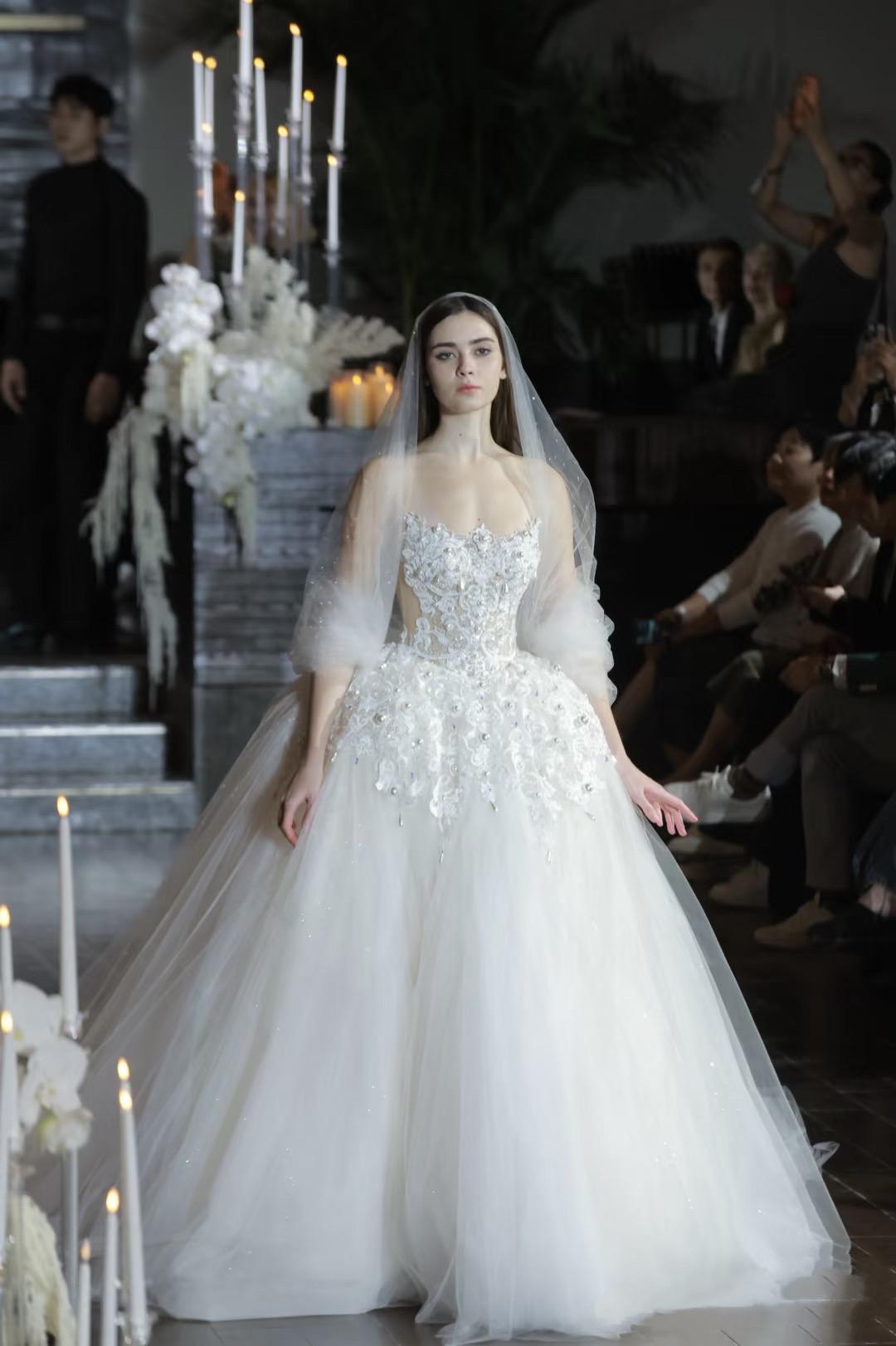 其實這場大秀,還有很多婚紗禮服的設計都比較有特點。蕾絲款婚紗、抹胸設計拼接裙襬,一看就是重工製作,細節上彰顯着品味。