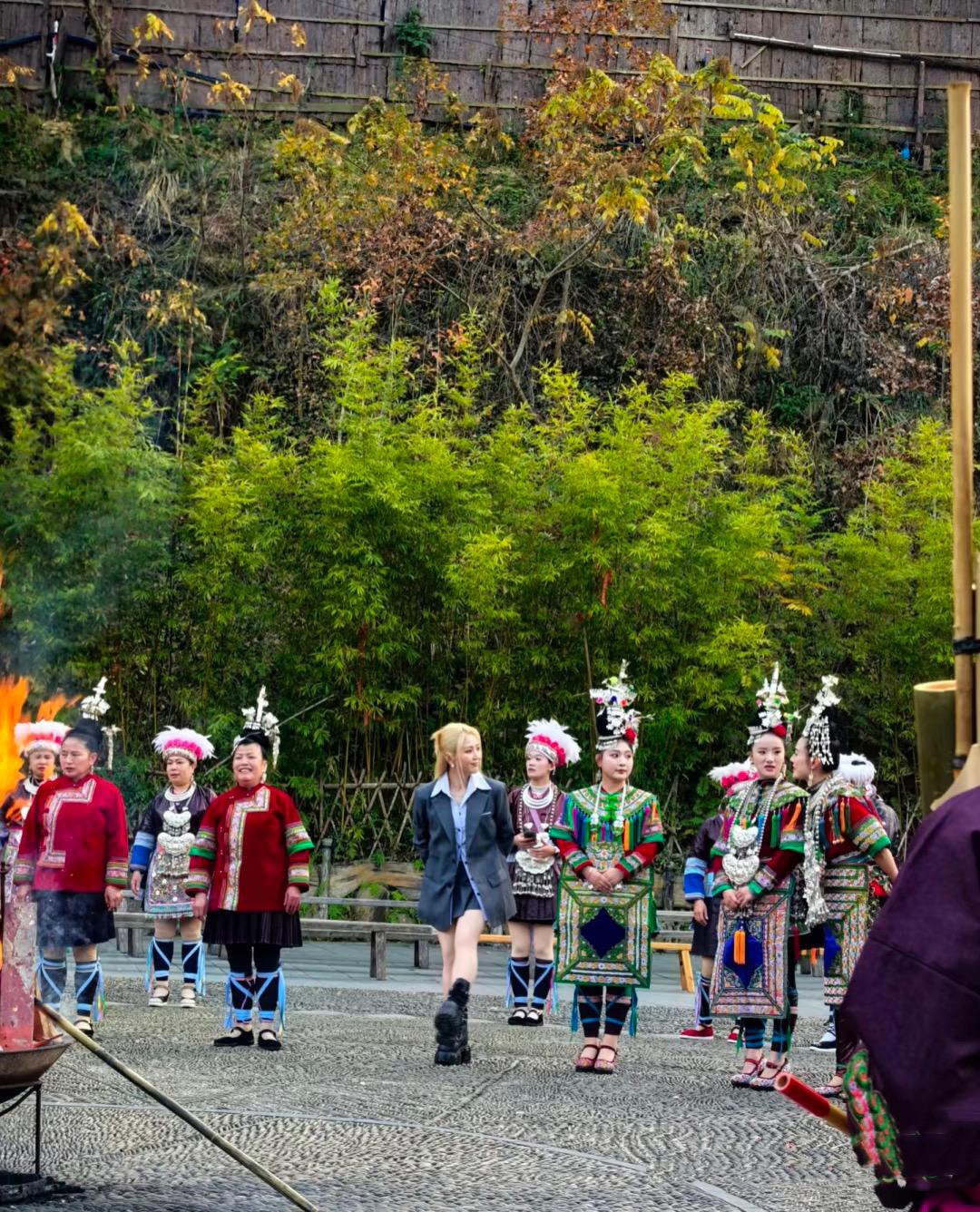 何潔本就是貴州人,這次現身侗寨錄節目,也是爲侗年活動造勢。何潔和穿着民族服飾的人一起跳舞,現場氛圍很歡樂。