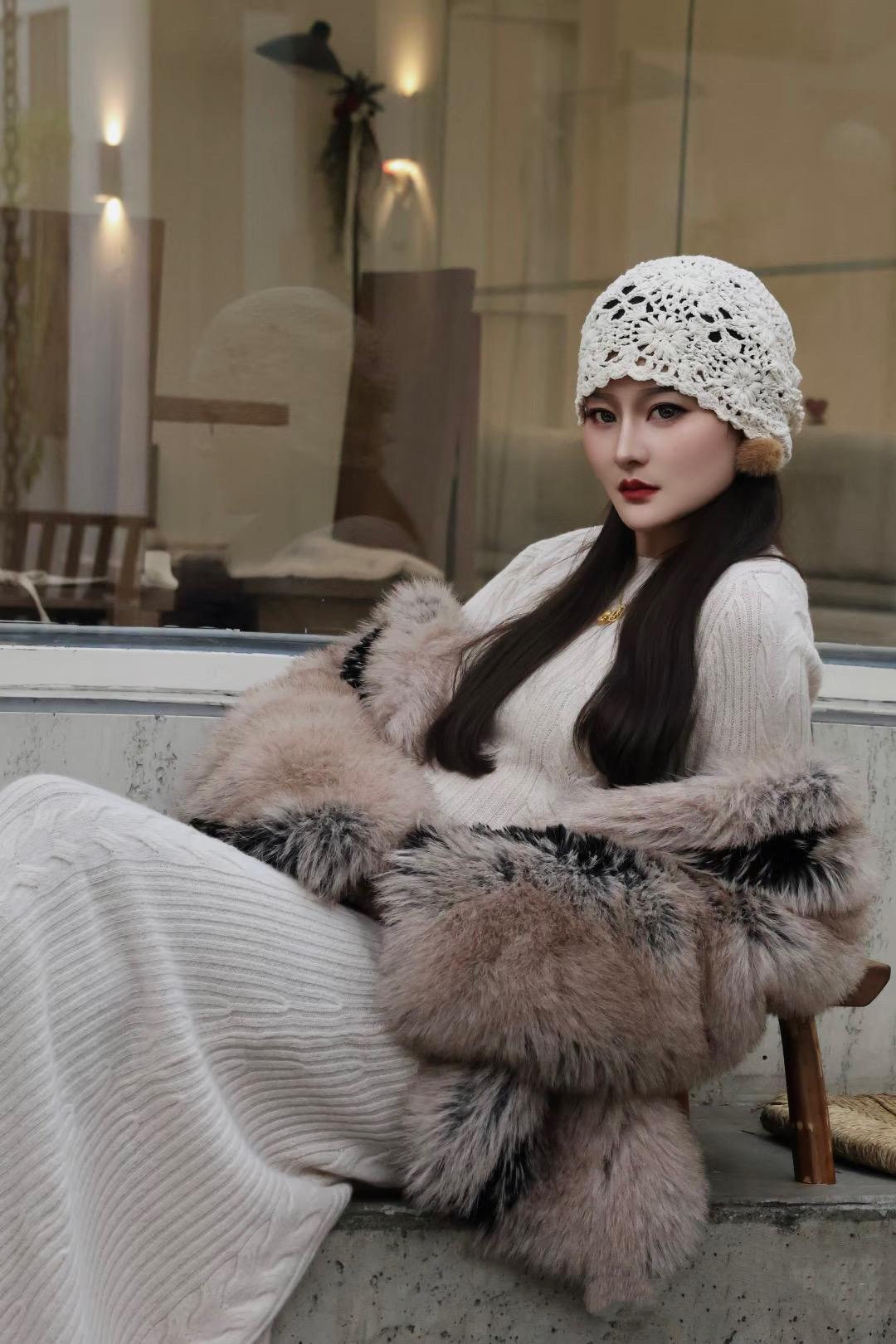 何潔還有一套很溫婉的造型,米白色的針織長裙,配一件皮草外套,光看背影就有一種很女神的感覺。