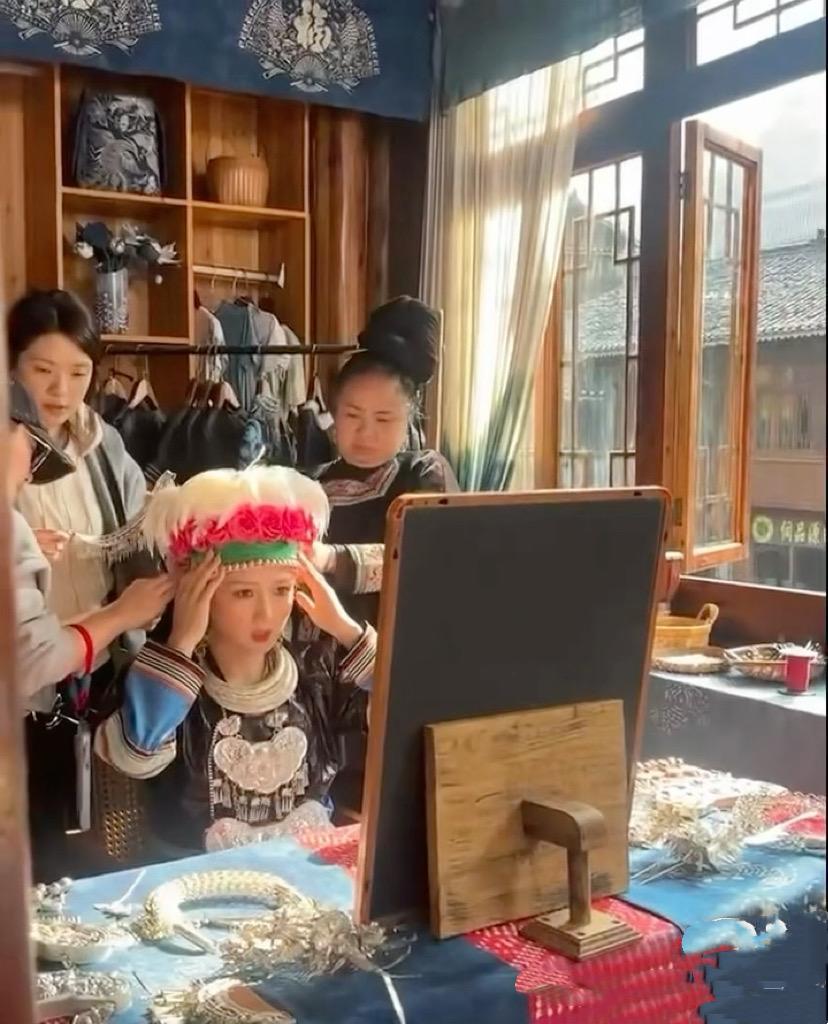 其實當天何潔並不是只有一套造型,她還嘗試了民族服飾,有工作人員給她化妝、打扮得更有民族特色。