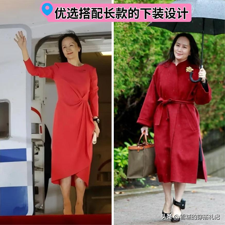 並且年紀過了40歲之後,在選擇下半身單品進行搭配的時候,長款的設計走向往往是更加極具優勢的,尤其是裙裝這樣的系列,在膝蓋以下的版型狀態,對於孟晚舟而言是更多高頻率的選擇,襯托出來的得體和穩定性能是比較高的。
