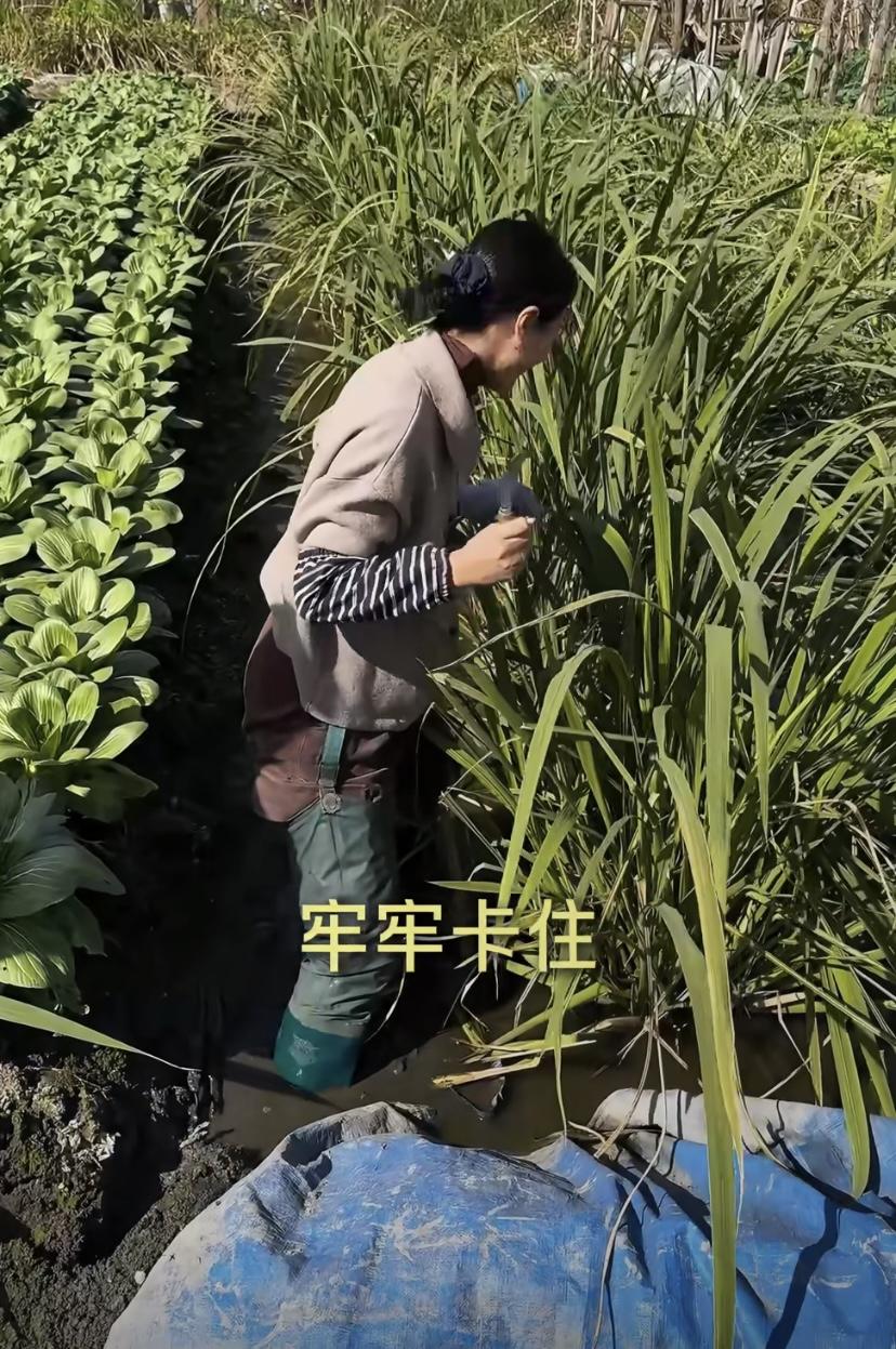 還有一個小插曲,就是在水田裏剪茭白的時候,朱丹的腳被卡在了裏面,怎麼都拔不出腳。只能說朱丹不經常下地、力氣不大夠。